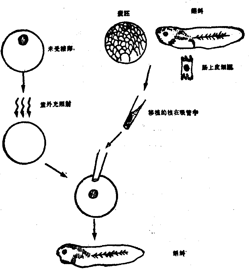 图3 蝾螈卵结扎的实验 如果结扎不是把卵子对分,而是前后分开,使相当于新月区的物质集中于一半,但不包含核,另一半不包含任何灰色新月区的物质而含有核,待到第二次分裂时再让一个核进入无核的一半。原先有核的一半立即开始卵裂,但最后只能形成一堆含有肠、肝和其他腹部细胞组成的团块;而包含灰色新月区的一半,虽然分裂晚些,第二次分裂时才有一个核迁移过去,却能形成一个完整的胚胎(图3,a、c和d)。和前一实验相比,这明确地说明,细胞质组分的分布在胚胎细胞分化中所起的决定性的作用。 后来,细胞核移植的工作又把核质关系的研究推进了一步。细胞核的移植(图4)是将一个细胞的核放进另一个细胞里去,通常是将囊胚期或更晚发育时期的细胞核注入事先已经用射线杀伤去核或者用吸管去核的未受精卵中,这样既排除了母体细胞核的影响,又因移植的细胞是双倍体,为正常发育提供了条件。童第周等利用这一技术,把金鱼囊胚期细胞核移到去核的鳑鮍鱼卵子,虽然发育到幼虫的例子极少,但是,发育都比较正常,一些基本发育的特点,如胚胎的背腹性、对称性以及早期的卵裂进程等都和鳑鮍鱼一样,身体形状也和鳑鮍鱼自交的幼鱼没有区别。性状的出现似乎完全根据细胞质。