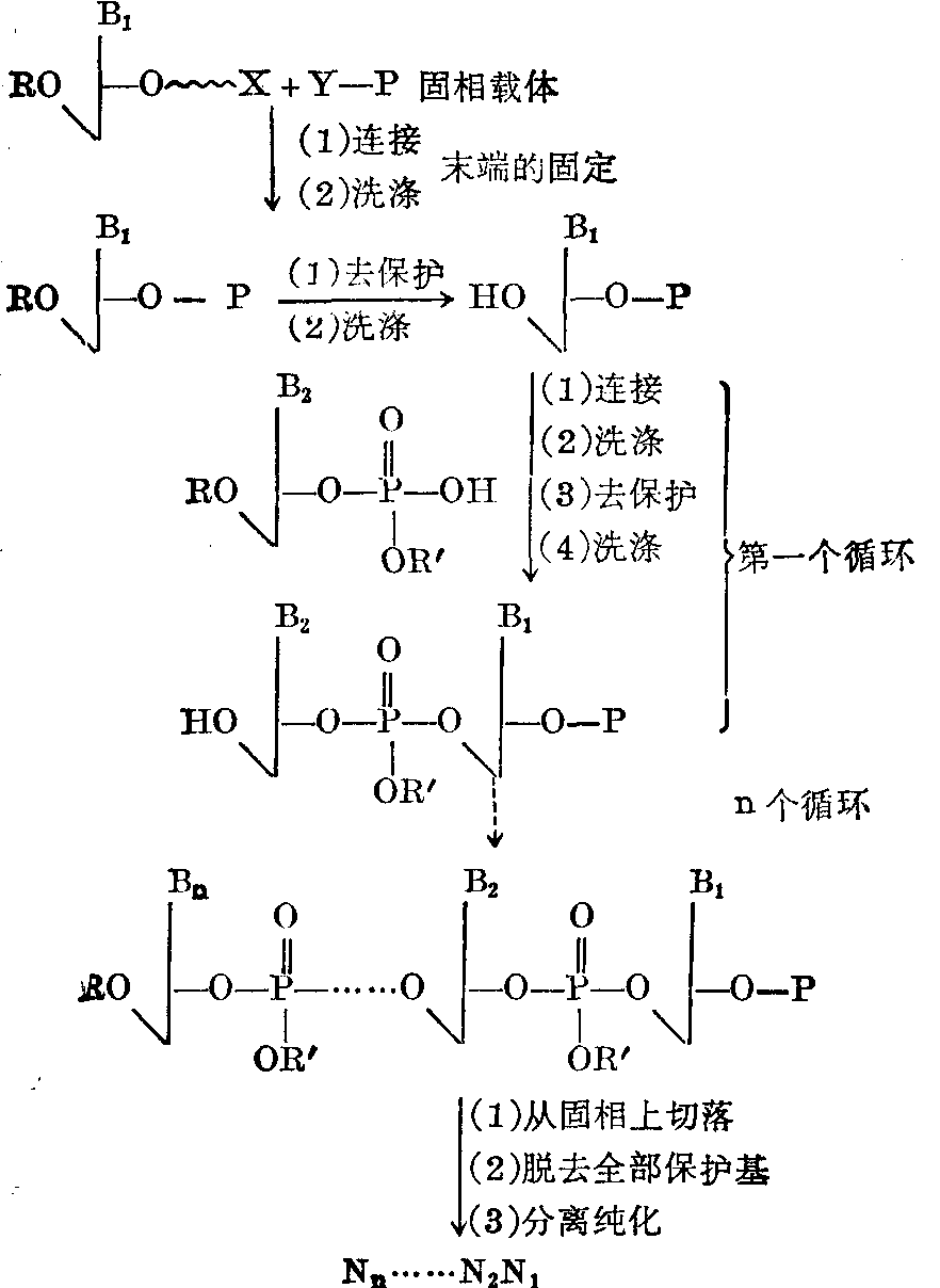 图3 用亚磷酸三酯法合成寡核苷酸 酯法和固相亚磷酸三酯法两种。前者所依据的方法基础是液相磷酸三酯法,即挂在固相载体上的羟基组份每次只与一个碱基和5′羟基都保护了的核苷-3′-磷酸二酯反应,中间产物是磷酸三酯(图1)。后者的化学反应基础是亚磷酸三酯法 (图2),其步骤是用保护核苷的3′-亚磷酰衍生物与挂在固相上的核苷或核苷酸链的5′羟基反应生成亚磷酸三酯型的中间物,然后再氧化得到磷酸三酯(图3)。 与固相磷酸三酯法相比,固相亚磷酸三酯法的突出优点是: ❶产率高,每轮连接的产率可达95~98%; ❷速度快,只需30分钟即可完成一轮缩合操作循环; ❸由于多轮缩合的产率很高,不仅可能合成较长的片段,产物也易于分离纯化,且能实现自动化和微量化。 随着核酸固相合成方法的建立和发展,近年来已经出现了各种型号的全自动或半自动的核酸合成仪。目前利用以固相亚磷酸三酯法为基础的最新型的 DNA 合成仪,其合成的长度已能达到60核苷酸左右,并正向100核苷酸进军。 ☚ 磷酸二酯法和磷酸三酯法 核糖核酸和脱氧核糖核酸的酶促合成 ☛ |
