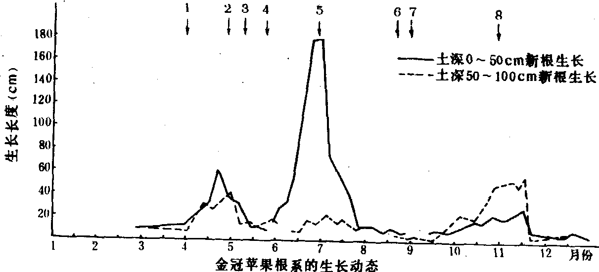 图3 金冠苹果根系的生长动态 多数落叶果树幼年树一年有三次生长高峰,如楸子砧的金冠苹果在山东、河北等地, 第一次生长高峰在3月中旬至4月中旬, 随开花和新梢旺长而转入低潮; 第二次高峰自新梢接近停长至花芽分化前, 一般在6月下旬至7月初出现, 这次是全年发根最多的时期, 随后由于果实迅速发育而转入低潮; 第三次高峰在9月上旬至11月中旬, 此时叶片同化养分向根部回流积累, 其后随着土温降低而进入低潮或停长(图3)。土层较深的果园,下层根有时全年都有少量新根生长,在冬季向阳处或有覆盖条件下,2月后天气回暖时也常有新根生长。成年树由于大量结果的影响, 根的第一次生长高潮多出现在新梢生长转缓时开始; 第二次多在果实采收之后。早春虽有新根生长, 往往形不成明显高潮, 在结果过多的年份, 采后高潮也不明显。 柑橘类果树根系在春梢发生前开始发根, 但量较少, 当春梢大量发生时, 根生长转弱, 大量新梢转绿后, 根系生长开始活跃, 在春梢发生前达到最高峰;第二次和第三次高峰分别在夏梢发生前和秋梢叶转绿后(图4)。