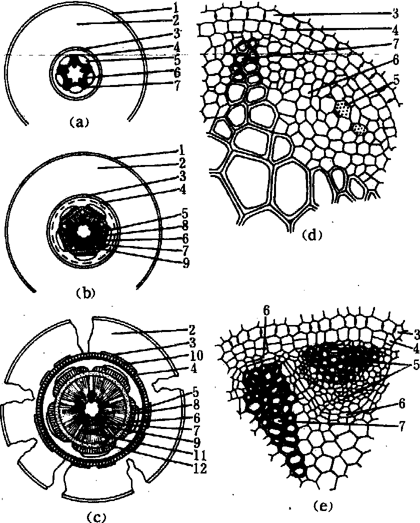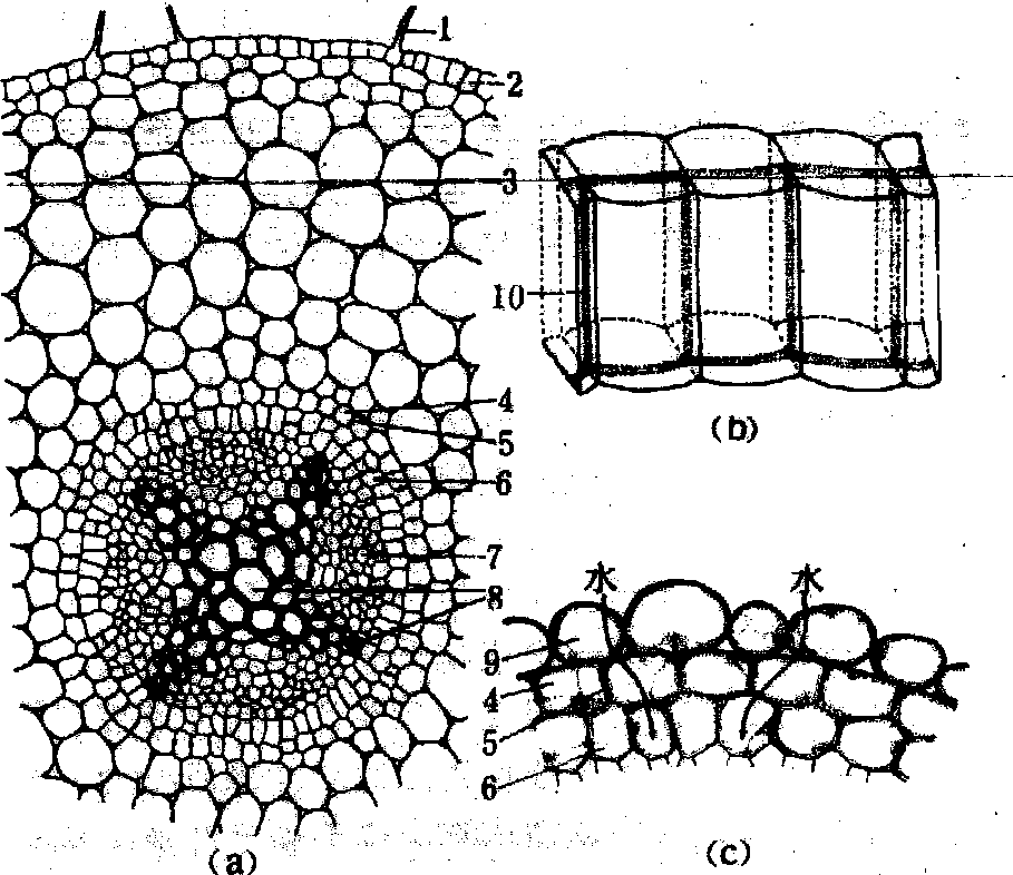皮层 由多层薄壁细胞构成,常贮藏许多营养物质。有些植物的皮层其最外一至数层细胞,体积较小,排列紧密,细胞壁常木栓化或木质化增厚,分化为外皮层,当表皮脱落时,起着保护作用。还有的植物在皮层中有乳汁管或树脂道分布。许多湿生植物根的皮层中常形成发达的气腔。 皮层的最内一层为内皮层。内皮层细胞近于长方形,以其长轴与根的纵轴平行,并以细胞的扁平面对向维管柱外表,细胞上下差参排列,无细胞间隙,在径向壁和横向壁上,其初生壁和胞间层中沉积木栓质和木质素,形成环带状增厚结构。这种环带状结构最初由德国植物学家凯斯伯里(J.X.Robert Caspary)于1865年发现,故称为凯氏带。当内皮层细胞被切成横切面时,其径向壁上增厚部分呈点状突出,又称凯氏点。内皮层细胞的质膜,牢固地附着在凯氏带上,当根内水分和物质作横向运输时,这种结构阻断了由胞间隙、细胞壁以及细胞壁与原生质体之间所形成的途径,迫使水和溶质主要只能经过内皮层细胞的质膜进行运输。紧贴内皮层凯氏带的质膜,对溶质的运输具有严格的选择和调控作用。许多单子叶植物和少数无次生生长的双子叶植物的根,其内皮层的细胞壁,在出现凯氏带加厚的基础上,常进一步沉积木栓质和木质,形成五面或六面加厚。仅位于初生木质部脊端的少数内皮层细胞保持初期凯氏带的结构,继续允许水和溶质有选择地通过,这些细胞称为通道细胞。 维管柱 皮层以内的整个中心部分,包括起源于原形成层的初生维管组织和非维管组织(中柱鞘),一般又称之为中柱。 维管柱的最外层为中柱鞘,通常由一层薄壁细胞组成,但禾本科、棕榈属、龙舌兰属、桑属、柳属中的一些植物的中柱鞘可以有数层细胞。某些水生植物和寄生植物的根无中柱鞘。中柱鞘保持分生的潜能,能产生侧根、不定芽。双子叶植物根的中柱鞘还可以形成木栓形成层和维管形成层的一部分。单子叶植物老根的中柱鞘,往往部分或全部呈厚壁状态,有时被原生木质部分子(禾本科、莎草科)或少数原生韧皮部分子(眼子菜科)所分隔。 初生木质部和初生韧皮部是维管柱中最重要的部分。初生木质部呈辐射状排列于根的中央,辐射脊尖端为原生木质部,脊末端为后生木质部。初生木质部分化成熟的方式称为外始式,是根初生结构的主要特点。有些双子叶植物和单子叶植物根的中央,没有全部分化为后生木质部而形成了髓。初生木质部的辐射脊数往往随植物种类而有不同,例如油菜、马铃薯、番茄等的主根有2个辐射脊,称为二原型; 豌豆、紫云英为三原型; 花生、向日葵、南瓜为四原型; 梨、苹果为五原型; 栎、葱为六原型。小麦7~10个辐射脊,玉蜀黍12个,甘蔗更多,棕榈可达百个以上。通常将超过6个辐射脊的统称为多原型。有时在主根和侧根之间,或不同品种之间,辐射脊数目可能出现不同。初生韧皮部束分布于初生木质部辐射脊之间,二者交互排列。初生韧皮部的分化成熟方式也是外始式的。 在初生韧皮部与初生木质部之间,常保留着一些来自原形成层的薄壁细胞。在能进行次生生长的根中,其中一层细胞成为维管形成层的一部分(图2)。 根的次生生长 大多数双子叶植物和裸子植物的根,在形成初生结构后,由于维管形成层和木栓形成层的产生和活动,使根能继续增粗,这种增粗生长过程称为次生生长。通过次生生长所形成的组织结构称为次生结构(图3)。 维管形成层发生与活动 位于初生韧皮部内侧保持未分化状态的薄壁细胞,首先进行平周分裂,其中一层细胞发育为形成层,并向两侧扩展,推移至初生木质部脊端部位; 后来,正对初生木质部脊的中柱鞘细胞也出现分裂活动,向内侧产生细胞参与形成层的形成; 最后,连成完整的维管形成层环,围绕于初生木质部四周。维管形成层主要进行平周分裂,向外产生次生韧皮部,向内产生细胞数量较多的次生木质部。在次生韧皮部和次生木质部中,有一些径向排列的射线薄壁细胞,它们具有横向运输的功能。维管形成层还能进行垂周分裂以扩大环的周长。在根的增粗过程中,初生韧皮部常被挤毁,但初生木质部仍保留在老根的中央。