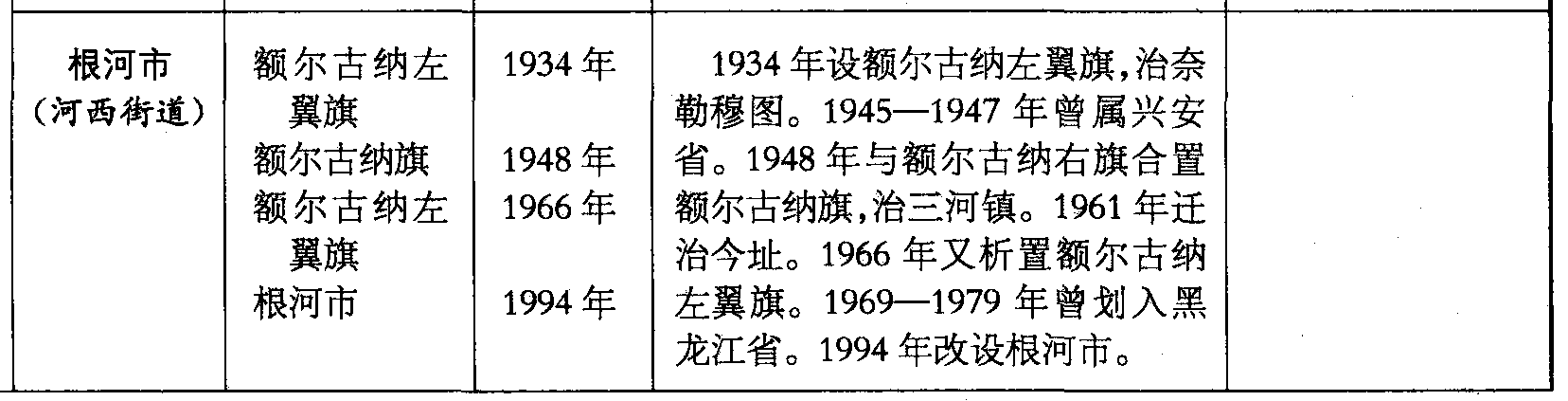 根河市(河西街道)额尔古纳左翼旗额尔古纳旗额尔古纳左翼旗根河市1934年1948年1966年1994年1934年设额尔古纳左翼旗,治奈勒穆图。1945—1947年曾属兴安省。1948年与额尔古纳右旗合置额尔古纳旗,治三河镇。1961年迁治今址。1966年又析置额尔古纳左翼旗。1969—1979年曾划入黑龙江省。1994年改设根河市。