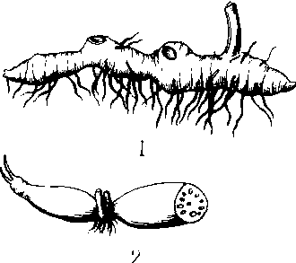根状茎 1.小黄精的根状茎 2.莲的根状茎 根状茎 根状茎genzhuangjing地下变态茎的一种。多年生植物的地下茎,形状似根,横卧在地下,有明显的节和节间;具顶芽和腋芽,节上往往有退化的鳞片叶。由于顶芽和腋芽的活动,茎轴既保持在地下生长,且每年能有新枝长出地面。每节生有不定根。由于根状茎衰老部分的死亡,由它产生的地上的新枝分离,故能进行营养繁殖。竹的根状茎称竹鞭,竹鞭上的顶芽能够不断向前生长;腋芽又称竹笋,由此生长地上茎。莲的地下茎称为藕,节特别细,节间粗大,可供食用。白茅的根状茎繁殖力强,是常见的田间杂草。根状茎中贮存有大量营养物质,可供发育需要;有的含有药用物质(如缬草)、染料 (如木香) 和鞣质如翻白草),等。 ☚ 球茎 鳞茎 ☛ 根状茎多年生植物的地下变态茎。形如根,但有节与节间之分。节上有退化鳞叶和不定根。具顶芽与腋芽,既保持在地下生长,每年又有新枝长出地面,如藕、姜、芦苇。 |