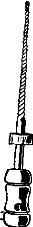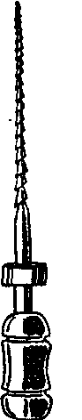 ❻螺旋根管充填器:用于将糊剂填入根管内。工作头为逆时针向的螺旋钢丝,有长柄和短柄两种,短柄为机用。工作头长度有14、18和22mm三种,螺旋粗细分为四种,其最大直径分别为0.22、0.31、0.44和0.64mm。使用时安装于弯手机上,以顺时针方向转动并逐渐退出,即可将糊剂填入根管内(图7)。