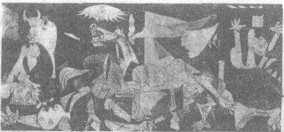 西班牙法西斯分子佛朗哥勾结德、意法西斯镇压西班牙人民的斗争。1937年4月26日德国出动空军对仅有7 000和平居民的西班牙北部重镇格尔尼卡进行了三小时的轰炸扫射,杀死1 654人,炸伤889人。全世界热爱和平、拥护民主的人民都奋起谴责法西斯暴行。画家毕加索,作为西班牙人,他义愤填膺,怒不可遏,立即拿起画笔,以这一事件为题材进行创作。头10天便画出了25幅草图,最后画成长349.3厘米、宽776.6厘米的世界名画《格尔尼卡》,控诉法斯暴行。他通过艺术的虚构和想象,表现战争与人类的灾难,使主题超越了表达的事件的时间与空间,具有反对战争暴行的概括意义。《格尔尼卡》创作后不久,德国法西斯便将战火燃遍了欧洲。德国法西斯占领法国期间,毕加索在巴黎居住,行动受到限制。因为他是名画家,德国驻法国大使“拜访”毕加索,要给他供应冬季取暖燃料,当见到《格尔尼卡》照片时说:“这幅画是你作的了?”毕加索回答说:“不,是你们。”他宁愿忍受饥饿和寒冷,戴着手套在画布上画香肠、蔬菜来“精神充饥”,也不接受法西斯的“帮助”,保持了一个爱国者的气节。