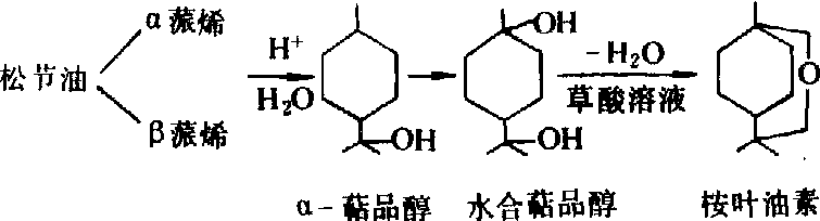 加工 得到桉叶油素有3种方法:❶从桉叶油分馏桉叶油素。将工业桉叶油(含桉叶油素约30%)进行减压蒸馏,再放置低温下冷冻结晶,经分离得到含80%桉叶油素的产品,平均每吨桉叶油素需3吨工业桉叶油。 ❷从天然樟脑油生产桉叶油素。将樟脑油减压蒸馏、冷冻、分离、脱色和离心分离,得到桉叶油素和副产物白樟油、松油醇等。每吨桉叶油素需要樟脑油3.6吨或芳樟油4吨(含桉叶油素30%)。 ❸用松节油合成桉叶油素。将松节油在25%的硫酸中加少量表面活性剂“平平加”处理,在30℃下进行水化反应,得到水合萜品醇,水合萜品醇经草酸(或硫酸、磷酸)溶液脱水,生成桉叶油素。其基本反应过程如下: