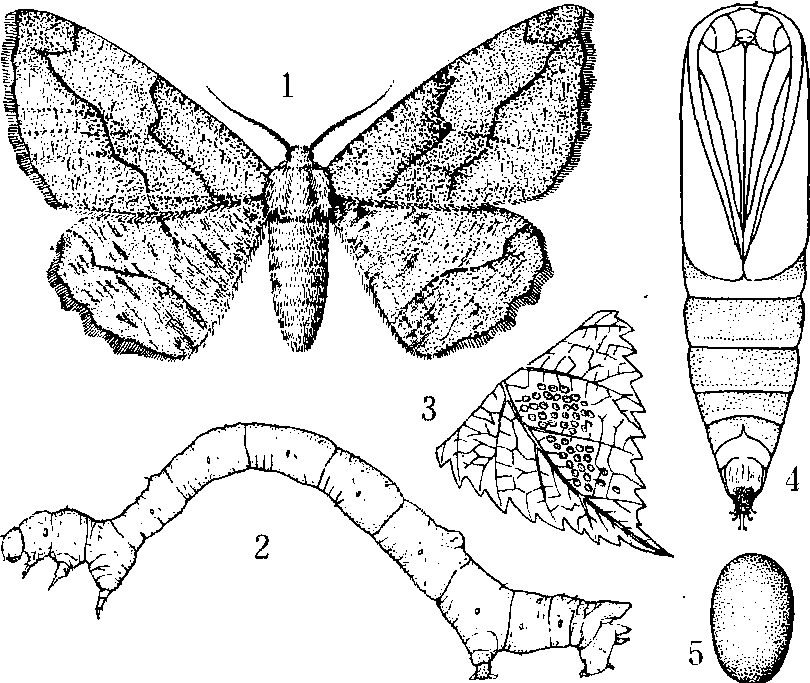 桑尺蠖 1.成虫 2. 幼虫 桑尺蠖 桑尺蠖sangchihuoHemerophila atrilineata无脊椎动物,昆虫纲,鳞翅目,尺蛾科。成虫体长16毫米,灰褐色,头小,前翅灰色,内外两边有2条暗黑色斜波状纹,外缘作不规则齿状。后翅仅有1条纹。幼虫灰褐色,前细后粗,成筒状。初孵化的幼虫为绿色,多在桑叶背面取食叶肉,使叶面呈现透明点,长大后变成灰褐色,近似树皮颜色,沿叶缘向内蚕食。越冬幼虫严重为害冬芽,仅留有芽鳞。幼虫爬行时,身体一屈一伸向前移动,在树上静止时,用1对腹足和1对尾足抓住树枝,身体斜向挺直悬空静止不动,与树枝成一斜角,形色均似枯枝,不易被天敌发现,这是幼虫的拟态本能,常做为拟态的典型代表动物之一。 ☚ 尺蠖 桦蛾 ☛ 桑尺蠖俗称“桑搭”、“造桥虫”、“寸寸虫”、“剥芽头虫”等。鳞翅目,尺蠖蛾科。危害新芽及桑叶的害虫。年发生4代,幼虫越冬。初春冬芽萌发时,越冬幼虫为害萌发新芽,严重时,整株桑芽食尽。幼龄幼虫食害桑叶,弯曲爬行,昼夜取食,3次蜕皮后,日伏夜食,沿叶缘向内咬食,往往形成大缺刻。幼虫体圆筒形,初绿色,渐粗大,呈灰褐色,长达52毫米,背面散生小黑点,第1、5腹节背面各有一横形突起,6、10腹节着生两对腹足。防治方法:1.束草诱杀越冬幼虫。2.桑芽露青前喷药防治。药剂种类有90%敌百虫1000—3000倍液,80%敌敌畏乳油1000倍液等。 |