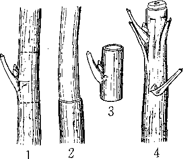图2 管状芽接 1、2.切取管状接穗芽 3.管状接穗芽 4.嫁接