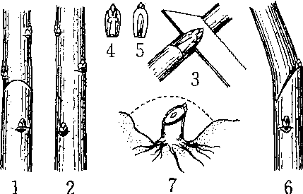 图3 简易芽接 1.砧木切口正面 2.砧木切口反面 3.切取接穗芽 4.接穗芽正面 5.接穗芽反面 6.接在苗千上 7.接在苗木根颈处 |
