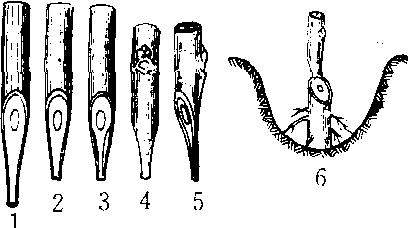 袋接 1. 第一刀削成的接穗 2. 第二刀削成的接穗 3. 第三、第四刀削成的接穗 4 .接穗背面 5. 接穗侧面 6. 插接穗和壅土 |