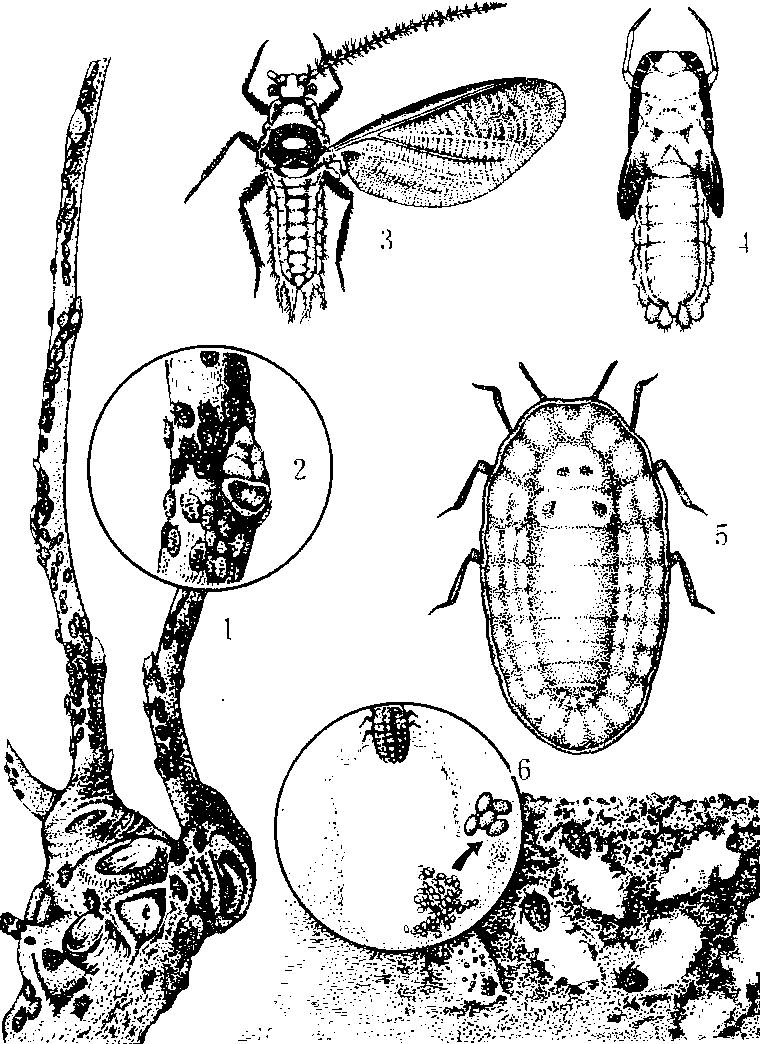 桑 虱 1.群集为害状 2.群集为害(放大) 3.雄成虫 4.雄蛹 5.雌成虫 6.卵囊及卵放大 7.表土层中卵囊