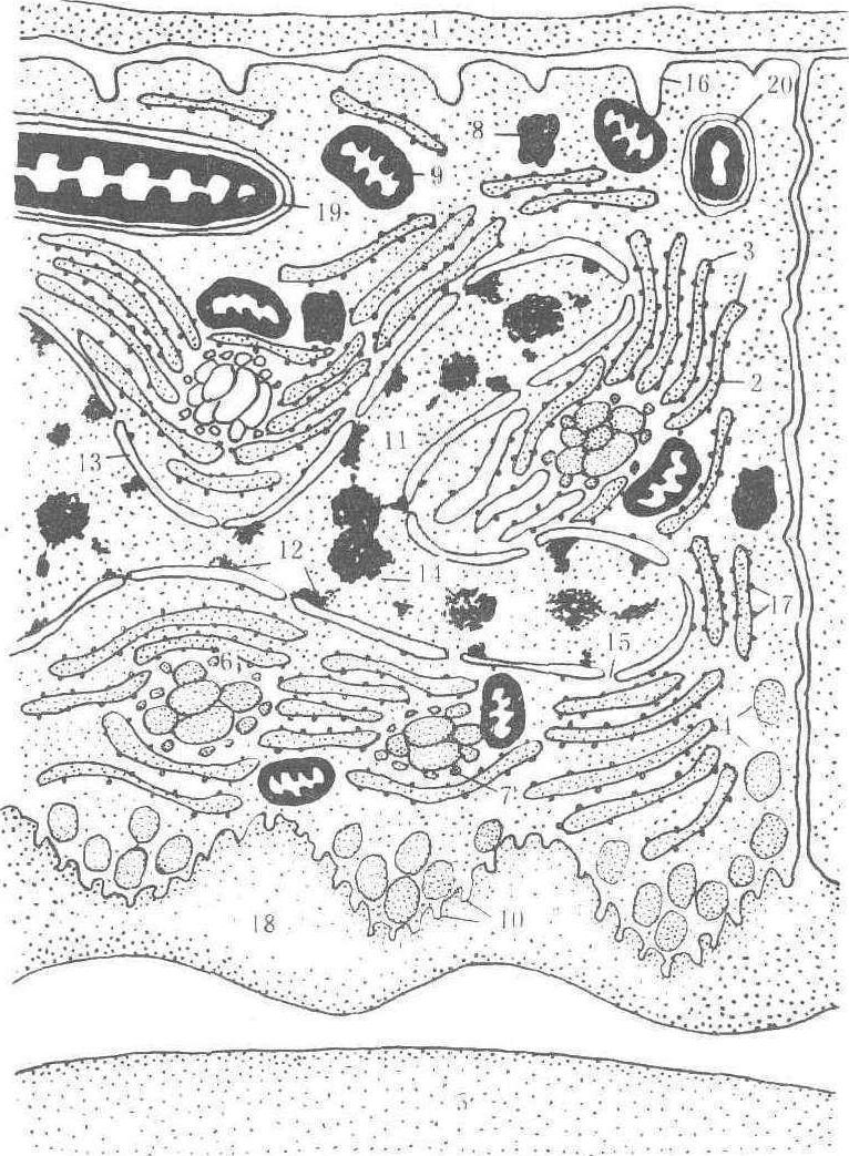 图 1 幼虫的丝腺 后部丝腺 从第4腹节开始,有许多屈曲,向后延伸到第6腹节(5龄盛食期后甚至延伸到第8腹节前端)以盲管终了。熟蚕时长达170~200毫米,管径1~1.4毫米,是丝腺中最长的部分。后部丝腺分泌丝素,不着色。 中部丝腺和后部丝腺上都有肌肉和气管分布,肌肉用以固定丝腺的位置,气管除供给氧气外,也有固定位置的作用。 丝腺的组织构造 丝腺壁由外膜、丝腺细胞、内膜3层构成,内腔充满丝物质。外膜是一层无细胞构造的薄膜,厚薄均匀,富有弹性,有保护细胞层的作用。内膜主要由几丁质组成,中、后部丝腺内膜有许多微孔,是丝物质分泌的孔道。内膜因丝腺的部位不同,厚度不一,前部丝腺的内膜较厚,中、后部丝腺内膜较薄,每眠更新。丝腺细胞呈长六角形,左右两列细胞环抱成管状,细胞核1龄时呈棒状,2龄以后逐渐分枝,到5龄期细胞核呈复杂的树枝状。丝腺细胞在胚胎时期已经分裂终了,在幼虫期只有体积的增大,没有分裂增殖。丝腺细胞数目及各部丝腺所占的比例,因品种而异。细胞数目以欧洲系品种为多,日本系品种及中国系2化性种次之。丝腺细胞的数目与产丝量有关,多丝量系统的细胞数较多。 5龄蚕后部丝腺细胞的细胞质中有发达的粗面内质网、高尔基体、线粒体等均匀分布。靠近外膜的细胞膜有许多折皱,靠近腺腔有微绒毛。在核糖体上合成的稀薄丝素,通过内质网转入高尔基体,并在其中浓缩成丝素小球,然后离开高尔基体累积在细胞的内侧,经过微绒毛向腺腔分泌。当后部丝腺内腔蓄积多量的丝素时,即向中部丝腺流动。中部丝腺各区的腺细胞微细构造,大致与后部丝腺相同,只是从中部丝腺合成的丝蛋白质是丝胶。丝腺在5龄第3天以后急速生长,丝物质的分泌量也迅速增多。丝物质的原料来源于桑叶,这时桑叶的质和量直接影响到丝物质的生产量,在整个5龄期间蚕从桑叶消化吸收的蚕白质约有70%成为丝物质(图2)。