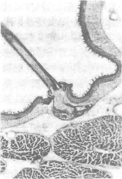 图1 体壁的构造 真皮层由一层细胞组成,每个细胞各有一个略呈球形的核,细胞膜不明显。真皮细胞中含有色素粒,是决定体色的重要因素,还含有尿酸盐类的结晶物,决定着体壁的透明度,凡是尿酸盐结晶较少或缺乏的部位或幼虫老熟时,尿酸盐通过血液转入泌尿器官时,体壁比较透明。还有一种油蚕,因真皮细胞内不能沉积尿酸盐,整个体壁透明如同油纸。幼虫期尤其是新表皮形成时,真皮细胞特别发达,细胞分裂增殖并增大呈柱形。在真皮细胞上端形成丝状小突起,分泌颗粒状物质形成新表皮。此外,有些真皮细胞特化成毛原细胞、蜕皮腺以及各种感觉器官(见桑蚕感觉)。 表皮层在体壁的最外面,是由真皮细胞分泌形成的非细胞性组织。体壁的作用和特性主要在于这一层。表皮层不仅包被在蚕体表面,而且是一切由外胚层内陷生成的器官组织如前肠、后肠、气管等的内壁。表皮层的表面有很多小突起,由内向外又分为内表皮、外表皮和上表皮3层。内表皮约占表皮层的4/5,由许多重叠的薄片形成。主要成分是几丁质与蛋白质,它们以共价键相连结成稳定的糖蛋白复合体。内表皮一般无色柔软,富延展性和弹性。在幼虫蜕皮过程中,大部分被溶解为真皮细胞所吸收。 外表皮的厚度约占表皮层的1/5,较内表皮薄而硬,在蚕体节间膜或其他柔软部位,外表皮极薄,甚至不存在。外表皮由内表皮的一部分转化而来,因而基本化学组成和内表皮相同。起蚕、新蛹以及刚羽化的成虫所形成的新表皮,只有内表皮和上表皮,因而质地柔软,呈乳白色,经一定时间,由真皮细胞产生的多元酚酶与积聚在上表皮下的表皮酪氨酸作用,生成3、4二羟基苯丙氨酸再被氧化成多元酚,最后被氧化成邻醌。这种邻醌向四周扩散并与蛋白质分子结合,使柔软而可溶的节肢蛋白,鞣化成较坚硬而不溶的骨蛋白。在表皮硬化的同时,形成黑色素,构成桑蚕的体色和斑纹。上表皮是表皮层的最外层,也是最薄的一层,表面有细小突起,上表皮不含几丁质,由壳脂蛋白层和腊层二层构成。壳脂蛋白层在外表皮之上,由绛色细胞分泌,由脂类和蛋白质结合的壳脂蛋白组成,为腊层的下垫面,具有支撑作用,并限制体躯过度生长,决定蚕体体表的模式。它是发生新皮时最先形成的一层,将新表皮和旧表皮隔开,旧皮的消化产物、水分可透过, 而蜕皮液不能通过,也不被蜕皮液溶解,腊层是体壁的最外层,在蚕体蜕皮前数小时,由真皮细胞分泌。通过孔道向上运输而形成。腊层的腊质类似蜂腊,主要是由醇和脂肪酸结合形成的酯,故具有亲脂疏水的性质。对表皮单位重量和单位面积所含腊质的绝对量,除起蚕稍低外,一般无大变化,但上蔟后与日俱增,特别是将化蛹时激增。腊层含腊量因幼虫饲料不同而有异,以改良鼠返为多,鲁桑较少; 同一桑品种以适熟叶为多,老叶和嫩叶少; 饲育中高温比低温多。腊层的含腊量多少决定体壁透过性的高低,含腊量愈多,透过性愈差,对防止蚕体内水分过度蒸散和阻止外物的侵蚀具有重要作用。腊层中含有的脂肪酸,特别是辛酸和己酸,可防止真菌侵入体内。内表皮和外表皮均有极微细的孔道纵贯上下,它们起自真皮层上伸至表皮的中央附近,分歧成树枝状,末端达上表皮的小突起中,是真皮细胞的细胞质向外伸出的细丝,在分泌活动结束缩入真皮细胞后留下的细管道。新皮形成时很多生化反应必需有真皮细胞的分泌物参与作用,而这些分泌物就是由孔道分阶段分泌运送的,如运送真皮细胞分泌的含有几丁质和蛋白质的物质,进行鞣化和着色反应所需的酚类及相应的酶系,形成或修补腊层的腊质等。在表皮形成后,孔道中充满硬化物质,成为表皮层的支柱。 蛹和成虫的体壁,其构造和幼虫大致相似,也由底膜、真皮和表皮3层构成。所不同的是: 成虫的真皮层很薄; 蛹和成虫的表皮层中,在外表皮与内表皮之间比幼虫多一层中表皮 (蛹和成虫的节间膜及成虫侧面表皮中缺乏外表皮和中表皮);表皮的鞣化程度也不同。蛹的表皮高度鞣化,外表皮着色深而坚硬,成虫表皮的硬化着色程度较蛹期轻,而且只限于头、胸部以及腹部的背面和腹面,故成虫腹部较柔软而有伸缩性。 体壁的衍生物 有体壁突起和蜕皮腺。体壁突起又可分为非细胞性的和细胞性的2类。非细胞性突起存在于幼虫表皮表面,为多数针状、刺状乃至棒状的小突起。这种突起的形状、大小和密度,因蚕品种和斑纹的种类而有不同。细胞性突起又可分为单细胞突起和多细胞突起两种。单细胞突起是由一个真皮细胞特化而成为毛原细胞。在幼虫期毛原细胞向体壁表面形成刚毛。刚毛与表皮成关节状,蜕皮时毛从基部脱落,由毛原细胞再生新毛,刚毛有触觉作用,成虫时毛原细胞向体表生成白色的鳞片,被复全体,鳞片基端有柄插入体壁,他端有数个缺刻。鳞片的形状和分布多少因着生部位而有不同,翅上的鳞片宽而短,缺刻多; 体躯上的较细长,缺刻少; 环节前方的鳞片较后方多,背面的鳞片比侧面多,节间膜上无鳞片。鳞片在体表整齐地呈复瓦状排列,有保护体躯的作用。多细胞突起是一部分表皮连同真皮层向外突出形成,存在于第8腹节背面中央的尾角。 中国特有的龙角蚕品种(图2),由于3眠和4眠中存在于第2、3、5、8等4个体节侧背线上的部分真皮细胞进行异常分裂,细胞肥大向体表隆起,形成瘤状体,4个环节上共生成4对,最多时,在第2~11体节的侧背线上均生出1