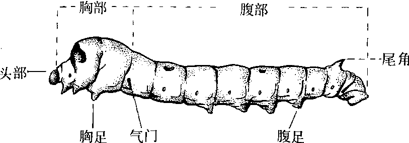 幼虫 蚕体呈长圆筒形,由头部和体部构成,头部略成半球形,位于最前方,外包暗褐色骨化头颅,其上密生刚毛,体部可分为胸部和腹部,胸部由3个环节、腹部由10个环节构成,在头部和前胸背面有稍呈三角形的颈膜相连接,除胸部背面以及腹部的第9和第10环节之间外,其他各环节之间都有节间膜,由于颈膜和节间膜极为柔软,因此头部和这些环节可自由转动、伸缩。在第8腹节背面中央有个锥形的肉质突起,称尾角。在第1胸节及第1~8腹节的各环节两侧,各有一对黑褐色椭圆形气门,共9对,这是呼吸器官的开口(图2)。