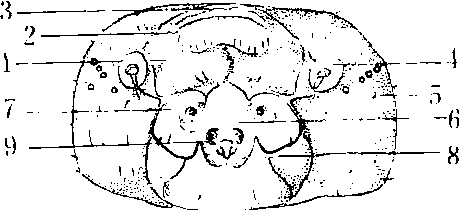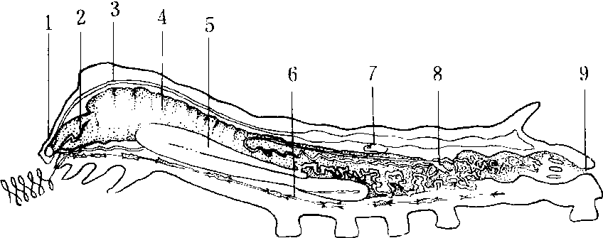 蚕体外面包被着具有着生肌肉、保持体形作用的体壁,其内方形成了体腔,所有内部组织、器官均浸浴在血液中,故体腔又称血腔。剖开蚕体观察,可见有一个长圆筒形的消化管从头部到尾部纵贯体腔中央,营消化、吸收和排粪等作用,消化管的后方两侧,各有3条淡黄色细长管沿消化管壁向前延伸,至消化管中部折回,后方形成许多屈曲,最后进入直肠壁,这是蚕的泌尿器官(又称马氏管)。消化管的腹侧方有一对半透明的屈曲纵走腺体,是丝腺。丝腺体在小蚕期很小,到5龄期才显著增大。沿腹中线近体壁处有一条有节的索,称神经索。其上的节称神经节,从各神经节分出神经分布到蚕体的各器官组织。在消化管两侧各有一条沿体壁纵走的黑褐色细管,以及由此分出的许多分枝,分布于体内各部,是专司呼吸作用的气管系统。在体壁背中线的下方,从头部到第9腹节有一条由薄膜构成的背管,起心脏和大动脉的作用,司血液的循环。在第5腹节背管两侧有一对白色的生殖腺,雄的呈肾脏形,称睾丸;雌的呈三角形,称卵巢。各分出一条生殖导管,雌的后端附着于第7腹节后缘体壁内面,雄的连接在生殖芽前端的两侧。体壁内面着生有各种肌肉,借以运动和固定内部器官组织的位置。在体壁下面及各器官间的体腔内分布有白色片状和带状的脂肪体,是合成和贮藏蛋白质、脂肪、糖原的器官(图7)。