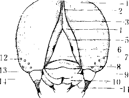图2 幼虫外形 头部的外面包着一层骨质壳片,表面着生左右略呈对称的刚毛,从头部前面看,由人字形的头盖缝,把头壳划分为3块,左右2块半球状骨片称颅侧板,中