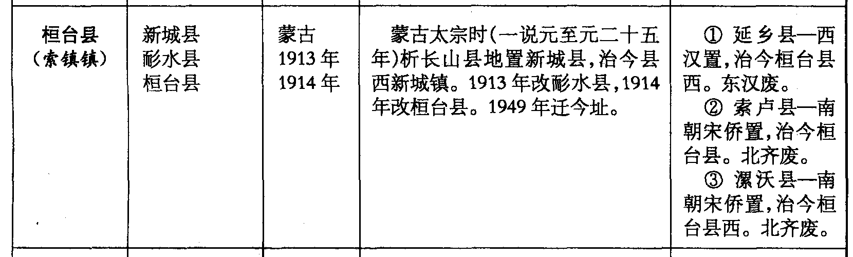 桓台县(索镇镇)新城县耏水县桓台县蒙古1913年1914年蒙古太宗时(一说元至元二十五年)析长山县地置新城县,治今县西新城镇。1913年改耏水县,1914年改桓台县。1949年迁今址。❶ 延乡县—西汉置,治今桓台县西。东汉废。❷ 索卢县—南朝宋侨置,治今桓台县。北齐废。❸ 漯沃县—南朝宋侨置,治今桓台县西。北齐废。