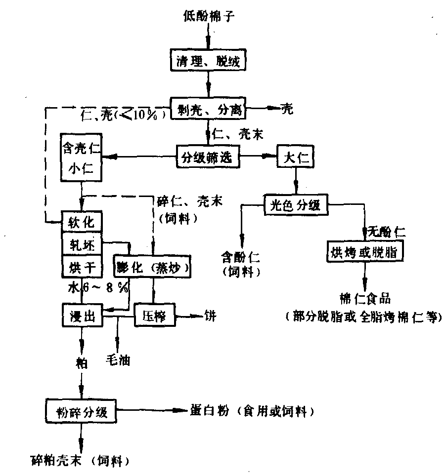 图3 低酚毛棉油精炼工艺流程 饼粕利用 普通棉子中含有棉酚有毒物质,必须脱毒后方可食用或作饲料。从饼粕中提取的棉酚可用于医药或其他工业。主要有三种棉子脱毒方法: ❶高温水热处理法(如蒸炒、压榨、蒸脱烘干等)。可使有毒性的游离棉酚与蛋白质中氨基酸等化合成毒性低的“结合棉酚”,但蛋白质同时变性使营养成分有所损失。 ❷溶剂浸出法。即利用混合溶剂(如乙醇-己烷、丙酮-己烷、二氯甲烷-己烷等)进行选择性低温浸出,将油脂与游离棉酚和蛋白质等进行有效的分离。 ❸化学添加剂法。例如把硫酸亚铁、碱液或者尿素等添加剂加到饼粕中,使棉酚破坏或变成结合状态,通常应用于饲料饼粕。此外,尚有发酵处理法,旋液分离色腺体法等,可供选用。 |