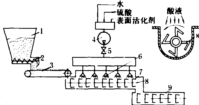 计量式棉籽稀硫酸脱绒设备示意图 1.喂料斗;2.螺旋推运器;3.输送带; 4.稀硫酸泵;5.阀门;6.喷头; 7.稀硫酸处理罐; 8.弯头杆式搅拌器;9.混合器 泡沫酸脱绒设备 以起泡的硫酸为棉籽脱绒剂。首先使棉籽迅速通过火焰烧绒器(温度500℃,通过时间1.5秒),烧去棉籽表面的长绒和残屑,经振动筛清除大杂物与碎屑,进入泡沫酸处理罐。浓硫酸、水、起泡剂经泡沫发生器使混合液起泡,撒注在酸处理罐内的棉籽上。起泡的硫酸是一种多孔物质,每个气孔壁都很薄,并含有均匀分布的硫酸,当棉籽与起泡酸混合,并受到处理罐内搅拌器的搅拌时,气泡破裂,棉籽短绒与泡沫酸接触面增大,由于泡沫酸的毛细管作用,促使其向棉籽的短绒渗透。酸处理后的棉籽进入两台结构相同的转筒干燥机,旋转转筒内部设有组合隔板,棉籽在干燥过程中表面水分蒸发,硫酸浓度增大,使短绒脆化;棉籽经组合隔板与热气流的推移和翻动,使短绒脱落,最后在中和器中用氨气中和残余硫酸,完成清选和拌药等工序,得到优质脱绒棉籽。 泡沫酸脱绒是计量式稀硫酸脱绒的发展,加入起泡剂使硫酸起泡后覆盖于棉籽表面,对棉籽作用柔和,化学渗透最小,具有稀硫酸脱绒的优点,又克服了烘干耗能大的缺点,因而是很有发展前途的脱绒方法。 |