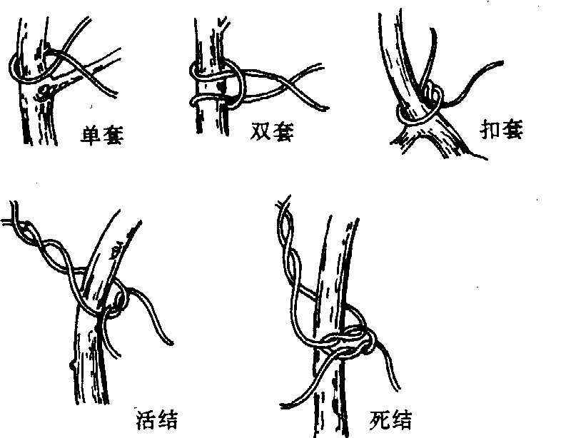 图1 棕丝整形示意 系棕方法有单套、双套和扣套三种。打结方法有活结和死结二种(图2)。