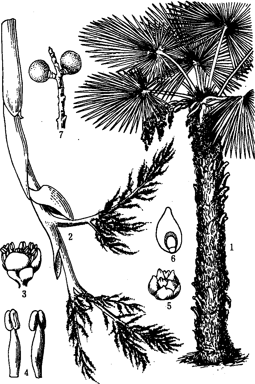 世界贸易市场的椰子 (Cocos nucifera)和油棕(Elaeis guineensis)是重要的油料植物; 椰子的中果皮是椰子壳纤维的来源,内果皮骨质坚硬,可制各种装饰品; 固态胚乳供生食、榨油或糖果食品原料,液态胚乳为鲜美可口饮料,也是植物组织培养基的重要组分; 花序轴含大量糖分,可供饮料或酿酒。省藤(Calamus platyacanthoides)茎为编织藤器原料。槟榔(Areca cathecu)的果实供药用,常为口含嚼料。观赏行道树有原产古巴的王棕(Roystonea regia)和原产澳大利亚的假槟榔(Archontophoenix alexandrae)。 棕榈科palm family; Palmae单子叶植物,常绿乔木、灌木或藤本。主干通常不分枝。叶羽状或掌状裂,或一至二回羽状复叶,互生,常密集于树干顶部,但藤本的叶为散生。肉穗花序,有佛焰总苞;花小,两性或单性,同株或异株,有时杂性,通常淡黄绿色;花被6枚,2轮,常有花被蜜腺,或雄蕊基部有蜜腺;雄蕊6枚,2轮,稀3枚或更多,花粉常具单沟或2沟;子房上位,1~3室,胚珠1枚。浆果或核果,外果皮常纤维状或覆盖有鳞片。种子胚乳丰富。染色体x=13~18。本科约217属,3 000种,分布于热带、亚热带,热带美洲和亚洲为其分布中心。中国22属,约72种,主产南部和东南部各省区。椰子和油棕是世界贸易市场中最重要的油料植物;椰子的椰壳(中果皮)纤维可用于编绳、制扫帚等,内果皮骨质,可制装饰品,固态胚乳供生食、榨油或糖果食品原料,液态胚乳为可口的饮料;棕榈的叶鞘纤维可制绳索、地毯、床垫、蓑衣、刷子等,亦供观赏。 |