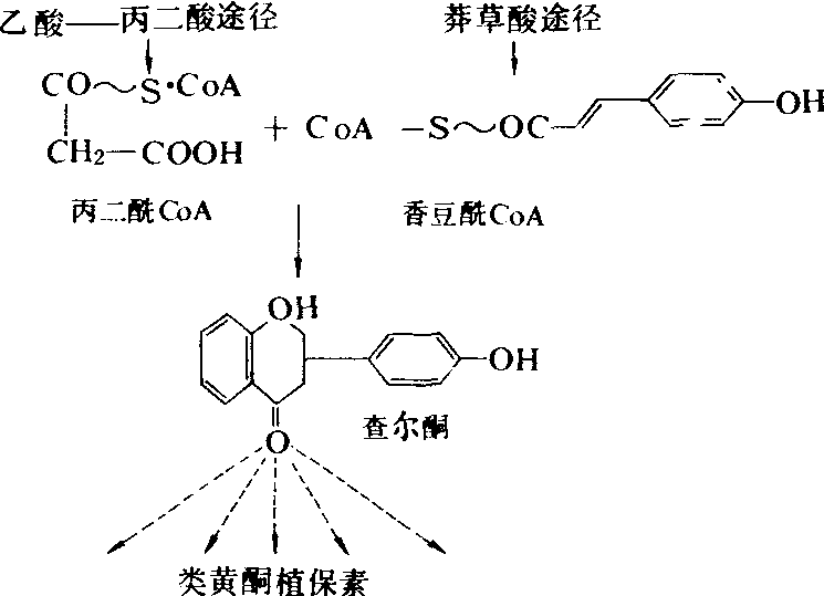 图1 代表性植保素结构图 黄酮类 主要存在于豆科植物中,有代表性的是豌豆素、菜豆素、大豆素和苜蓿素等。豌豆感染褐腐病积累豌豆素。菜豆感染炭疽病或立枯病后,在体内很快形成菜豆素。大豆对大雄疫霉的抗性,部分是由于寄主组织中积累了大豆素。致病菌刺激形成的大豆素的能力大于非致病菌;抗病品种较感病品种形成更多的大豆素。黄酮类植保素在体内的生物合成途径是乙酸—丙二酸途径和莽草酸途径混合形成。丙二酰辅酶A和香豆酰辅酶A经黄烷酮合成酶加工成查尔酮,然后由查尔酮再衍生为各种黄酮类(图2)。