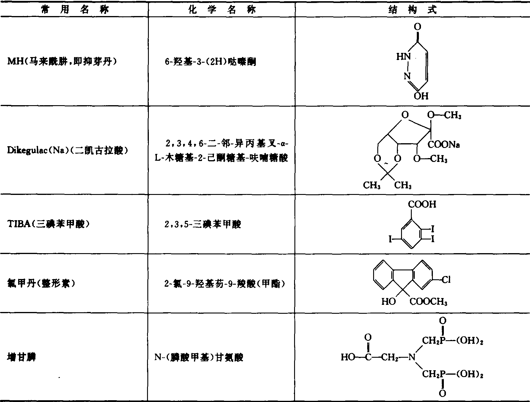 注: +表示正效应; -表示负效应;+ - 表示有双重效应 生长调节剂能有以下作用: 促进种子萌发和插条生根; 诱导成花或疏花疏果; 改变花期避免霜冻; 促进单性结实;调节成熟期以增加果实贮藏性, 或便于机械化采收; 促进或抑制营养生长等。有些作用是一种生长调节剂单独引起, 有的则是两种或多种生长调节剂相互协调, 或相互颉颃, 达到某种平衡而表现出效应。每种生长调节剂都是在一定的植物组织或器官,在遗传物质的信息中发挥作用(见图)。 ![]() 生长调节剂和遗传信息表达和器官建成的关系图解 种类与效应 生长调节剂按其效应分为5大类,即生长素、赤霉素、细胞分裂素、乙烯及生长抑制剂与延缓剂。但有些生长调节剂由于使用时期和浓度不同, 而可以发挥不同的效应。 生长素类 1934年,首先由F.克格尔F. Kogl等从燕麦胚芽鞘中分离得到吲哚乙酸, 不久又发现并合成了吲哚丁酸(IBA)、吲哚乙腈 (IAN)、吲哚乙醛(IAAld) 等;萘乙酸及其同系物: 萘乙酸 (NAA)、萘丙酸(NPA)、萘氧乙酸 (NOA); 苯酚化合物:(2,4-DP), 2, 4, 5-三氯苯氧乙酸(2,4,5-T), 2,4,5-三氯苯氧丙酸(2, 4, 5-TP)、4-氯苯氧乙酸 (4-CPA)等。生长素在果树上, 可以促进生根, 防止落果、疏花疏果、抑制萌蘖枝的发生。生长素的生理作用是使细胞伸长, 促进形成层活动, 影响顶端优势和防止衰老等。这些作用通过影响原生质膜的生理功能, 促进核糖核酸(RNA)的合成而实现。 赤霉素类 1926年, 日本黑泽在中国台湾研究水稻病害时发现。20世纪50年代, 英、美开始生产赤霉素, 中国也合成了赤霉酸(GA3)。赤霉素是一类同分异构化合物, 由于广泛存在于高等植物, 所以不断发现新的异构体, 目前已知有GA1~GA73。商品有赤霉酸(GA3)普洛马林(promalin) GA4+7和GA1+2等几种。赤霉素能使果树新梢节间伸长, 促进新梢生长, 打破休眠, 和促进苹果、山楂、枣、柑橘、穗醋栗、无花果, 以及巴梨等多种果树的坐果, 能使核果类单性结实,使玫瑰露葡萄形成正常大小的无籽果粒,防止柑橘果皮衰老, 推迟柑橘和香蕉的成熟, 抑制苹果、梨、山楂、桃、柑橘、长山核桃等果树的花芽分化。赤霉素只溶于醇类、丙酮, 难溶于水。施于植物后, 在体内移动性差。其作用通过促进α淀粉酶的合成, 防止IAA的分解, 促进RNA的合成。 细胞分裂素 1913年,哈尔洛特(Haherlaudt)发现有刺激细胞分裂的激素,1948年斯科格(F. Skoog)与崔澂也指出嘌呤有促进细胞活力的微弱作用。但第一种细胞分裂素, 直到1956年才被米勒 (C.O.Mil-ler)等人鉴定为6-呋喃氨基嘌呤。其后, 发现了玉米素〔6-(4羟基-3-甲基-3-反式丁烯基)氨基嘌呤〕,人工合成的有细胞分裂素(Verdan、BA、BAP) , 激动素和PBA等。此外,二苯脲(DPU)和苯莱特, 也有促进细胞分裂的活性。这类活性物质可促进葡萄坐果, 提高新梢、侧芽的萌发率, 增大分枝角度, 促进花芽分化,也可使葡萄雄花变为两性花, 防止衰老。细胞分裂素为脂溶性。根尖是细胞分裂素合成的部位,随上行液流向正在进行细胞分裂的部位移动。幼果和未成熟的种子含量较多,伤流中也可发现。细胞分裂素,通过影响核酸或蛋白质的合成或降解, 实现其生理效应。 乙烯发生剂 乙烯催熟的原理,早为人们利用。中国古代用瓷缸密封, 使柿子脱涩; 美国加利福尼亚州用煤油炉加温的篷帐, 使青色柠檬变黄, 都是利用果实本身或煤油不完全燃烧所产生的乙烯。20世纪70年代, 把乙烯作为一种生长调节剂。商品的乙烯发生剂有乙烯利 (Ethrel Ethephon CEPA), 被果树吸收后, 在pH4.1以上, 即分解释放乙烯; CGA-15281〔2-氯乙基-三(乙甲氯乙氧)硅烷〕,是在体外发生乙烯而后进入植物体内。乙烯具有抑制新梢生长、促进花芽分化、疏除花果、促进成熟和促使果梗离层形成等作用; 晚秋喷布, 能使翌年花期延迟。乙烯可以促进多种酶的活性,并可使生长素分解, 或抑制其合成,或阻滞其向先端运输而生长素水平下降。 生长抑制剂 自1949年第一次发现烟碱类化合物具有生长延缓作用以来,已在多种植物内找到抑制剂,如脱落素、酚和酚基类黄酮化合物。其中有的对生长起延缓作用, 有的通过破坏生长细胞分裂而起抑制作用。天然的生长抑制剂,大多数是芳香族的有机物质,存在于休眠期的种子、芽或枝条中, 制约着休眠, 如脱落酸、苯甲酸、香豆素、肉桂酸和核桃酮等; 人工合成的生长抑制剂, 有青鲜素(MH、马来酰肼、抑芽丹)、代剪灵(aikegulae)、调节膦(krenite)和 off-shoot-o(高级脂肪酸的混合物)等。作用于顶端分生组织,抑制细胞分裂,干扰核酸的形成, 甚至可使幼嫩部分枯萎脱落, 起剪梢作用。它的作用不能被赤霉素所逆转。由于顶端优势受抑, 可以促进侧芽萌发成分枝。三碘苯甲酸(TIBA)和整形素 (9-羟基-9 羧酸芮的衍生物),有促进仁果类、核果类花芽分化, 提高坐果或疏果, 分枝角度开张及矮化作用。其作用机理是抑制生长素和赤霉素的生物合成及传导, 在分生组织中抑制有丝分裂; 人工合成的生长延缓剂, 常见的有矮壮素(CCC、CYCOCEL、Chloromequat),矮健素、B9(比久、B 995、Alar,daminozide、SADH),多效唑(控长灵PP333、Paclobutrazol cuttar)。这类调节剂的主要效应,是能使新梢节间变短而抑制生长,达到矮化和促进花芽分化的目的, 也有提高仁果类坐果、疏除核果类果实的效应。B9还有抑制果实生长、防止苹果采前落果、推迟仁果类果实成熟的作用, 从而提高果品品质,减少果实生理病害, B9