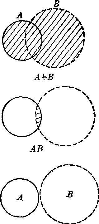 P(A)=p。(2) 在许多实际问题中,当概率不易求得时,只要n充分大,可以将频率作为概率的估计值。 在一定条件下,肯定发生的事件称为必然事件,肯定不发生的事件称为不可能事件。可能发生也可能不发生的事件,如未出生的婴儿是女的、某人的血型(未查血型前)是O型等事件,称为随机事件,亦称偶然事件,简称事件。必然事件的概率等于1,不可能事件的概率等于0,随机事件的概率介于0与1之间。 “事件A和B中至少有一个发生”也是一个事件,称此事件为A、B之和或并,记作A+B。“事件A和B同时发生”这一事件称为A、B之积或交,记作AB。例如对某地农民粪检结果,有蛔虫阳性者,钩虫阳性者,钩虫、蛔虫均为阳性者,则“钩虫和蛔虫中至少有一阳性”这一事件称为钩虫阳性与蛔虫阳性这两事件之和;钩虫、蛔虫均为阳性称为这两事件之积。 如果两事件A、B不可能同时发生,就说A、B互不相容。如某人的“血型为O型”或“血型为A型”是互不相容的两事件。如果互不相容的诸事件的概率之和等于1,就说它们构成完备系,例如诸血型构成完备系。当完备系中只有两个互不相容的事件时,就说它们是相互对立的事件,如“血型为O型”与“非O型”是相互对立的事件。事件A的对立事件记作A。两事件A与B的关系可示如图。 概率运算法则 (1) 加法法则: 对于任意两事件A和B中,至少有一个发生的概率为