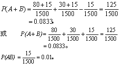 A.B互不相容 A、B两事件关系示意 P(A+B)=P(A)+P(B)-P(AB)。(3)若A、B互不相容,则 P(A+B)=P(A)+P(B)。(4) 式(4)可推广到有限个互不相容的事件。相互对立事件的概率之和等于1,即 P(A)+P(Ā)=1。 (5) (2)乘法法则: 在“事件A已发生”的条件下,事件B发生的概率称为B的条件概率,记作P(B|A)。对于任意两事件A和B同时发生的概率为 P(AB)=P(A)P(B|A), 或 P(AB)=P(B)P(A|B)。(6) 若A(或B)发生与否并不影响B(或A)的概率,就说A与B相互独立,这时P(B|A)=P(B)或P(A|B)=P(A)。若事件A与B相互独立,则事件AB的概率等于A的概率与B的概率之积,即 P(AB)=P(A)·P(B)。(7) 这一法则可推广到有限个相互独立的事件。 例1 某单位检查全体人员1500人的寄生虫病,结果: 80人有蛔虫病,30人有钩虫病,15人兼有蛔虫病和钩虫病。设“患蛔虫病”为事件A,“患钩虫病”为B,求P(A+B)及P(AB)。以频率作为概率,按式(3)