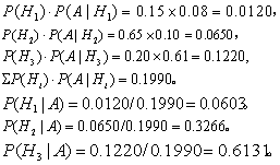 例4 某地区根据多年的某种病史分析,将病例分为甲状腺机能低下(H1)、正常(H2)与亢进 (H3) 三类,并得: P(H1)=0.15,P(H2)=0.65,P(H3)=0.20。若仅按“食欲亢进”指标(A)而言,根据积累的资料得: P(A|H1)=0.08,P(A|H2)=0.10,P(A|H3)=0.61。今有某病员新近食量大增,试分别求其甲状腺机能低下,正常与亢进的概率。 按式(8)得