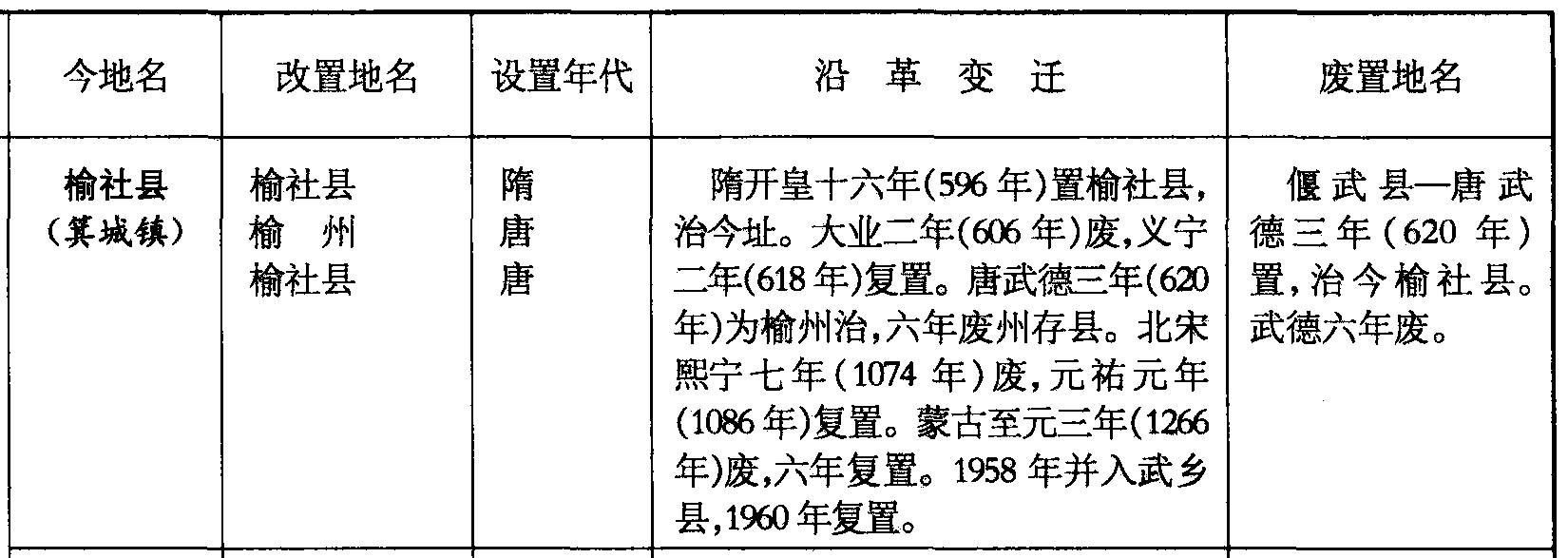 榆社县(箕城镇)榆社县榆州榆社县隋唐唐隋开皇十六年(596年)置榆社县,治今址。大业二年(606年)废,义宁二年(618年)复置。唐武德三年(620年)为榆州治,六年废州存县。北宋熙宁七年(1074年)废,元祐元年(1086年)复置。蒙古至元三年(1266年)废,六年复置。1958年并入武乡县,1960年复置。偃武县—唐武德三年(620年)置,治今榆社县。武德六年废。