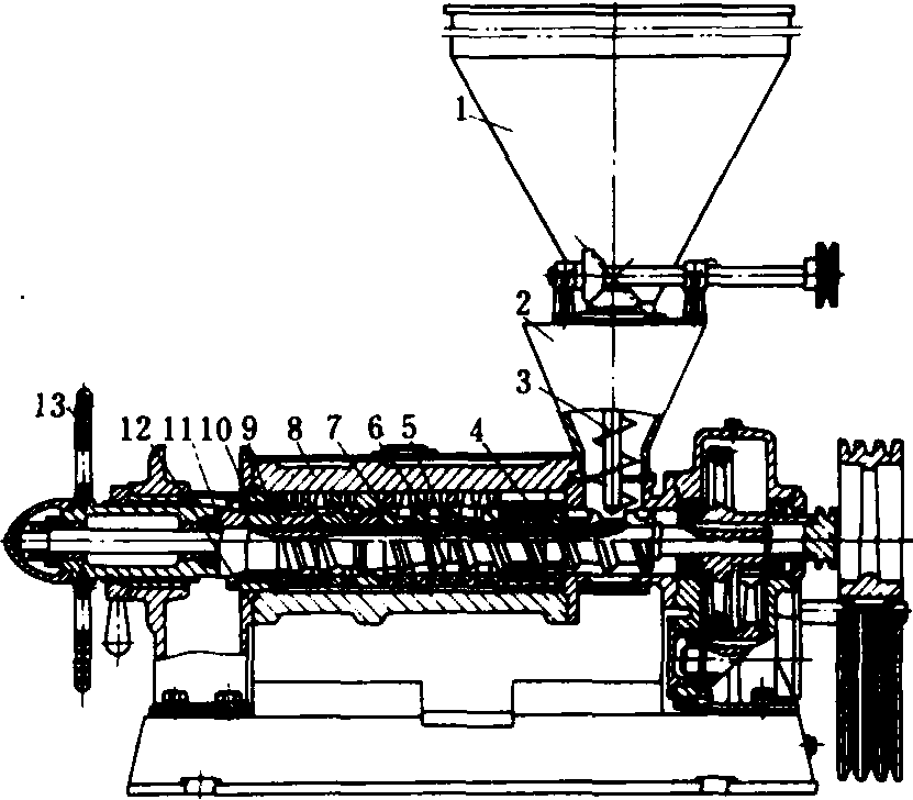 螺旋榨油机 利用榨螺将榨料在榨膛内连续推进时,由于榨膛空间(即空余体积)逐渐缩小而形成压榨作用。在压榨过程中油脂从榨笼缝隙内不断被挤出,而残渣被压成坚饼从出口端连续排出。因而属于一种在动态挤压作用下取得毛油的设备。 一般结构及工作原理 螺旋榨油机的典型结构(图)包括:进料装置、榨膛(榨笼与榨螺轴)、调饼机构、传动系统以及机架等部件。大中型榨油机还附设榨油机蒸锅。❶榨膛。由榨笼与榨螺轴相配合而形成的榨膛空余体积按一定的规则变化,榨膛进、出口端空余体积的比值称“压缩比”。榨膛空余体积从进口到出口连续缩小的称“一级压榨”;缩小后扩大然后再次缩小的称“二级压榨”或“三级压榨”。榨膛的排列方式有一段横置、直横两榨膛组合与两段横榨膛组合三种型式。榨笼部件组装形式有榨条(条排)拼合型、榨圈(圆排)叠装型与组合型三种。而榨笼整体结构又有直筒式、阶梯式与分段组合式三种,榨条型榨笼配有榨刀(刮刀),调装方便、结构简单、出油缝隙可调而应用广泛;圆排型榨笼装拆方便,但缝隙不易调节,多用于小型榨油机。榨螺轴螺旋齿形有锥形根圆变导程连续齿、圆柱根圆变导程断续齿(大、中型)以及曲线截面齿形(小榨油机)等。 ❷进料装置。除小型榨油机外,大多采用强制进料机构,具有喂料均匀、避免架空、预压成型有利于提高处理量与出油率等优点。主要型式有: 开式喂料斗、封闭直立桨叶式以及变速螺旋输送喂料装置等。 ❸调饼机构。用以调节出饼厚薄并在一定范围内改变榨膛压力的部件。主要结构型式有: 可移调饼套式、整轴移动抵饼圈式以及可移动出饼套式三种。按操作方式又有手工(手轮或撬杆)调饼、机动调饼与液压调饼之分。 ❹传动系统配置。榨螺轴通常由一级胶带传动与闭式齿轮箱传动,而喂料机构、蒸锅搅拌轴以及出渣螺旋输送器等均可采用联动机构,也有单独配置传动方式的。