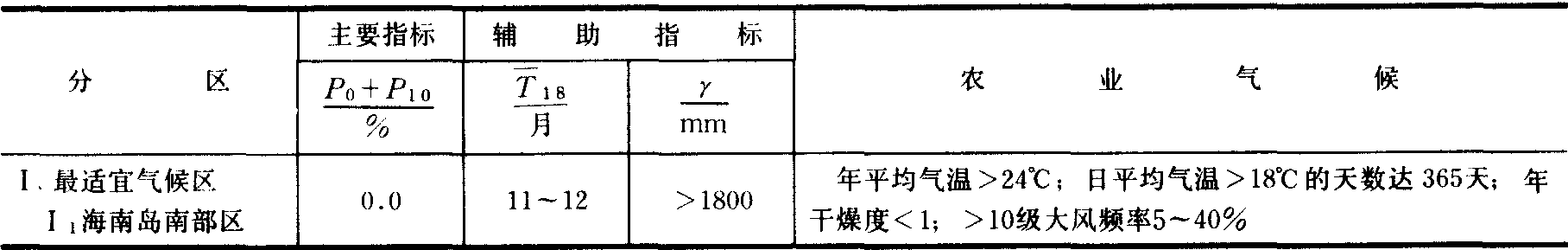橡胶树气候区划xiangjiaoshu qihou quhuaclimatic divisions for rubber trees根据橡胶树的农业气候指标制定的农业气候区划。 中国橡胶树分布在南起北纬18°14′ (海南岛崖县), 北至25°N(云南保山县的怒江农场)之间。包括广东、云南、广西、福建及台湾省南部, 区划工作只考虑主产地广东、云南南部。以橡胶树低温寒害指标作为划区的主要指标,其中两项具体指标为:❶极端最低气温≤0℃出现机率P0(%); ❷日平均气温≤15℃的阴冷日在20天以上 (两次阴雨天气过程间隔期3~5日), 期内平均气温≤10℃过程的出现机率P 10(%)。以上两种指标如出现一次, 橡胶树严重寒害率即可达30%以上。辅助指标是: 以月平均气温≥18℃的月数亍18作为橡胶树生长期长短的指标, 以年降水量γ作为水分指标。具体区划见表。 中国橡胶树气候区划指标及分区  (续表)