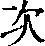 【提示】第一笔是侧点,旧字形是横。 *次cì6画 冫部 (1) 排在前项之后;第二:~要|~日|~子|其~。 (2) 质量、品质较差的:~货|~品|这个人太~,一点儿不讲信誉。 (3) 等第;顺序:~序|名~|车~|依~进场。 (4) 量词。用于计量可反复出现的动作或事物:出国五~|第三~国内革命战争。 (5) 〈书〉 停留在外;也指外出远行停留的处所:途~|旅~|~于京都。 (6) 〈书〉 泛指某事物中间:言~|胸~。 次 ☚ 歌 欺 ☛ 次cì春秋金文、小篆、隶楷均为会意兼形声字。从欠从二,二亦声。二的古音声母是舌尖鼻音,与舌尖前音偶通,故“次”读c-。二、次韵母相同。有“第二”的意思。如:次日|次子。引申为质量较差的。如:次货|次品。又引申为等第,顺序。如:依次前进|次序。引申为出外远行所居止的处所。如:旅次|舟次。又引申为“回”。如:次数|第一次。 次★常◎常