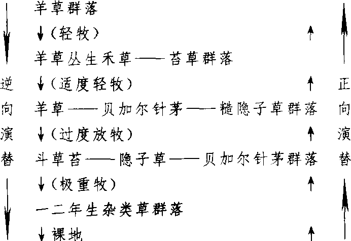 次生演替系列secondary sere次生裸地或原生植被群落开始的植物群落中,顺序发生一系列的演替群落阶段。包括植物群落退化和复生两个过程。原生群落在外界因素(如垦殖、放牧、火烧)及其他灾害作用下,由较复杂、相对稳定的阶段向较简单和相对稳定性较差的阶段退化。当外界因素作用停止后,又趋向恢复到破坏前的原生群落类型。次生演替经历阶段及速度,决定于外界因素的作用程度和持续时间。如羊草草原长期放牧,牧草高度降低,草被破坏,土壤沙化。放牧停止后.草地得以休养牛息,逆向演替转向正向演替,其次生演替系列如下图: