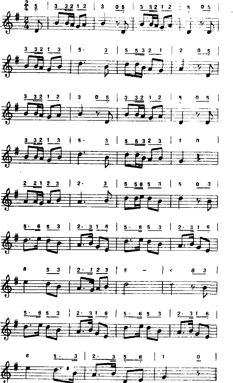 本歌曲从第一小节至第八小节为上乐句,停在属和弦音“re”上为半终止,第九小节至第十六小节为下乐句停在主音“do”上,这样上下乐句共十六小节组成第一乐段。从第十七小节至二十小节为四小节过渡加句。从第二十一小节至三十六小节又是上下两个乐句组成第二个乐段,因此本歌为二段体结构。