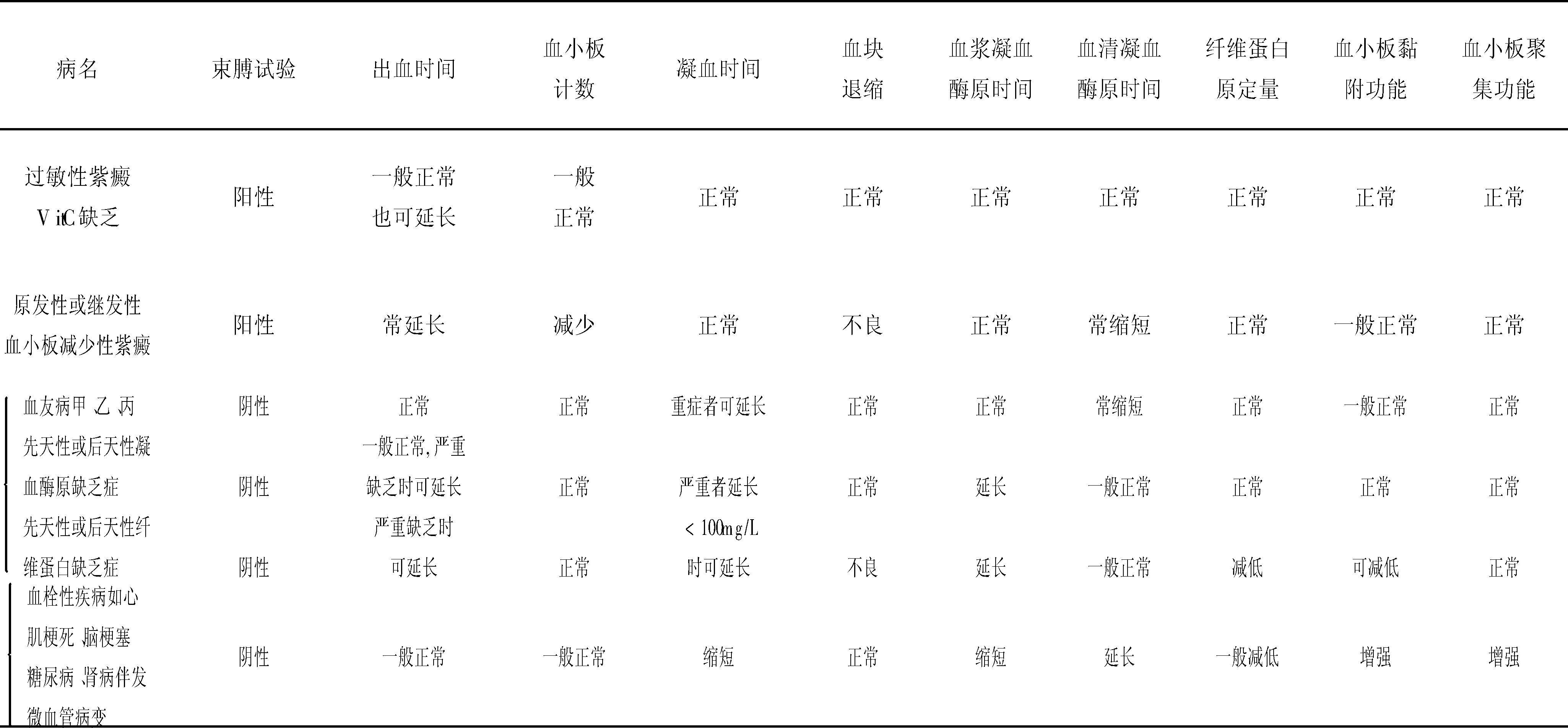常见出血、血栓性疾病的一般实验室检查结果