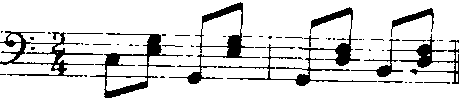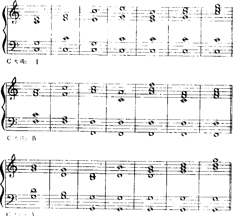 在伴奏进行中间有些和弦也可以重复五音,在少数经过情况下,也可以重复三音。这种重复往往出现在弱拍,短拍和经过拍。