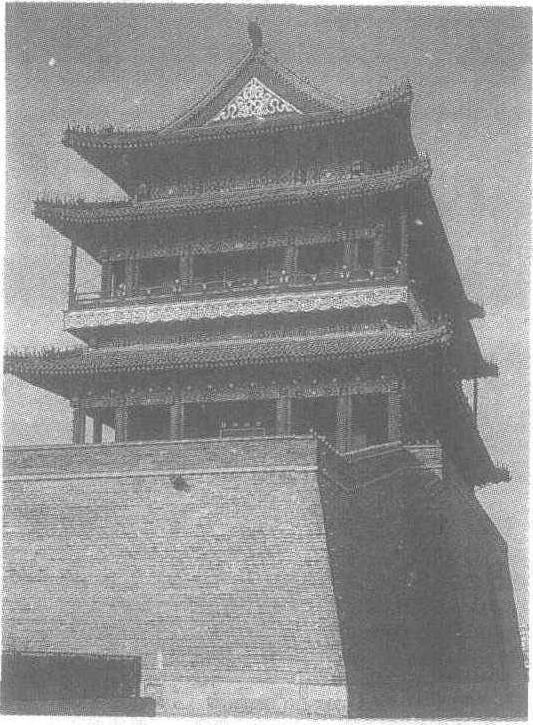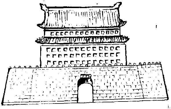 正陽門箭樓示意圖 正阳门中国古城门。俗称前门。是北京仅留下的2座内城城门之一(另一座为德胜门的箭楼),是明清两代北京内城的午门。初建于明永乐十八年(1420),城外有1座箭楼(南箭北城)。正阳门城楼建在一砖砌的城台上,台顶东西长95 m,南北宽31.45 m,高14.7 m,正中有拱券式门洞,门宽6 m,城楼面阔7间(36.7 m),进深3间(16.5 m),高27.3 m,屋顶为歇山顶形式,有3层檐,阁楼2层,通高42 m,为京城9门之首。箭楼建在12 m高的城台上,楼高24 m,面阔7间,进深3间,上下共分4层,东、西、南3面墙上及2层檐之间共开有94个箭窗,北面有延伸出来的庑座,面阔5间,进深12 m。箭楼通高38 m,是京城最高最大的箭楼。 正阳门 正阳门俗称前门。是明、清两代北京内城的正门。始建于明永乐十九年(公元1421年)。由城楼和箭楼两部分组成。箭楼在前,为重檐歇山顶式建筑,灰筒瓦,绿琉璃剪边,饰“鸦乌墨”彩画(彩画中的第三种)。墙的东、西、南三面,各辟四层箭窗。并设82个箭孔。城楼在后,建筑形式与箭楼同,但规模大,且比箭楼高。它饰“和玺小点金”彩画(彩画中的第二种),前后各辟2座门,左右各辟1座门。正阳门是京城九座城门中最壮丽的一座。1988年,它被国务院公布为第三批全国重点文物保护单位。