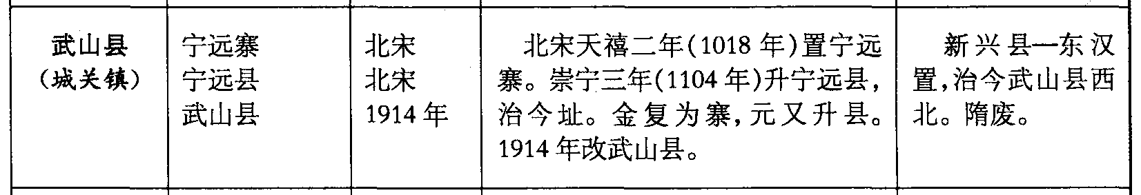 武山县(城关镇)宁远寨宁远县武山县北宋北宋1914年北宋天禧二年(1018年)置宁远寨。崇宁三年(1104年)升宁远县,治今址。金复为寨,元又升县。1914年改武山县。新兴县—东汉置,治今武山县西北。隋废。