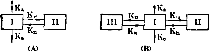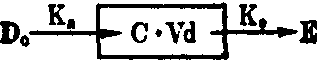 一室模型D0为给化学物量; Ka为吸收速率常数; K 为消除速率常数; C为血浆中浓度; Vd为分布容积; C·Vd为体内化学物量; E为化学物消除量。最简单的毒物动力学模型为一室模型,如下图所示。该模型假设给化学物后,它能立即均匀地分布于所有组织中,并在组织与体液中达到平衡,血浆中浓度的改变能定量地反映其他组织中浓度的改变,最后通过排泄或生物转化消除。此时,静脉注射即刻吸收后,并按一级速率从体内消除,其消除速率可表示如下: ![]() C为t时的血浆化学物浓度,Ke为此化学物的消除速率常数,即单位时间内(分钟-1或小时-1)浓度变化量与存在浓度之间的比值,负号表示化学物从体内消失。则任何时间的血浆浓度(Ct)表达如下式: ![]() 实际上一室模型较为少见,大多数化学物在体内的过程符合开放式二室模型,也有三室模型,甚至多室模型。如下图所示。
