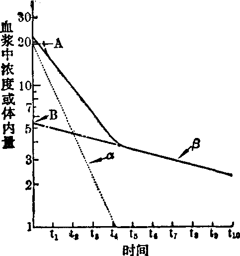 血浆中浓度或体内量与时间的函数关系模拟图 化学物入体的初期,分布与消除同时进行,主要反映化学物从中央室向周边室分布,称分布相,亦称快相,血中化学物浓度在半对数纸上呈直线下降; 待分布达到平衡后,血中浓度趋于缓慢下降,反映化学物自体内的消除,称消除相,又称慢相。将此β直线部分向纵轴延伸,所交纵轴的点为B值。将血中化学物实测值减去β线上同一时间各相应点的数值,其差值在同一半对数坐标纸上可得到另一条α直线,交于纵轴的点为A值。此直线主要反映药物向组织的分布。若化学物的消除过程中出现一个明显的慢相,提示重复接触时,有产生蓄积毒性的可能。 根据A,B,α,β各值,可按下式求出各速率常数。
