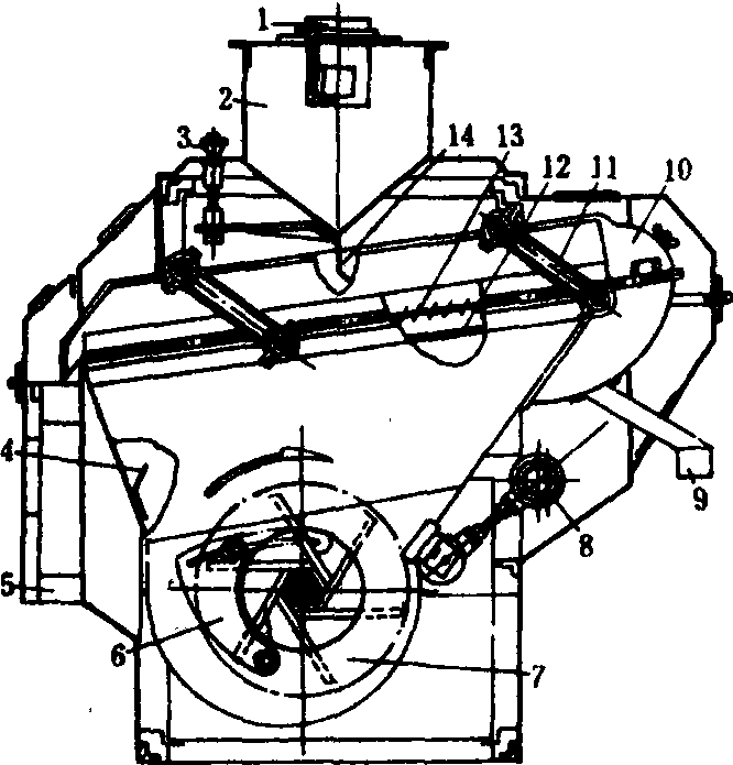 吹式比重去石机 1.进料口; 2.进料斗; 3.进料调节手轮; 4.导风板;5.出料口; 6.进风调节装置; 7.风机; 8.偏心传动机构; 9.出石口; 10.精选室; 11.吊杆; 12.匀风板;13.去石筛面; 14.缓冲匀流板 吸式比重去石机 其结构与吹式基本相同,只是自身不带风机,在去石筛面上装有气密良好的吸风罩及吸风管,与加工厂风网的风机相接,作业时尘土不外扬,因而使用较多。为简化结构和便于制作,有些国家的吸式比重去石机的去石筛面多采用直径为1毫米的钢丝编织而成,筛体用弹簧支承,由振动电机驱动。 比重去石机specific gravitystone separator利用谷粒与杂质颗粒的比重不同以清除重杂质的机械。主要工作部件是振动筛和风机。工作时,应用振动和气流的共同作用,使比重小的谷粒上浮,由物料的上表面向下滑,经出料口排出,而石子等重杂质则下沉到接触筛面,由筛子向上推移并从出石口排出。比重去石机按气流供应方式不同有吹式和吸式两类;筛面有冲孔筛和编织筛两种。 |