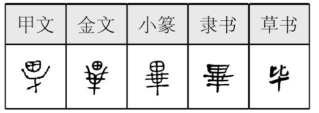 bì表意,甲骨文、金文、小篆从田,田为田猎,下象打猎用的长柄网具形,隶定为“畢”。本义表示用于打猎的一种长柄网,假借为完结、副词(相当于“全、都、完全”)等。近代俗字、《简化字表》简作“毕”,形声,从十,比声。 【辨析】 ❶以“毕”作音符构成的形声字一般读bì:哔、筚、跸。 ❷“毕(畢)”可作类推简化偏旁使用,如:哔(嗶)、筚(篳)、跸(蹕)。毕 畢; 甲 金 篆 隶bì【析形】象形字。甲骨文字形像田猎时用的长柄网,上像网,下有长柄。金文字形或增“田”,像网之形。今简化字作“毕”,上半从比,作声符。 【释义】《说文》:“田罔也。”(罔,网的古字)本义是田猎时所用的带有长柄的网。由网义引申为网罗无遗,就是尽,全。又引申为完毕,如[毕业]、[礼毕]。 [原形毕露]本来面目完全显露,多用于贬义。[毕其功于一役]把应该分成几步做的事一次做完,亦以形容急于求成。 【shape analysis】It is the pictograph character.In Oracle,it looks like the long-handled net used for hunting for the animals,the upper like the net,and the lower like the long handle.In Bronze Inscriptions,the added 田is the net-shaped. 【original meaning】The long-handled net for hunting animals. |