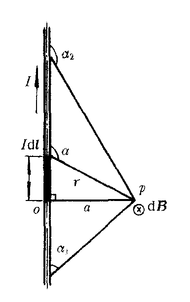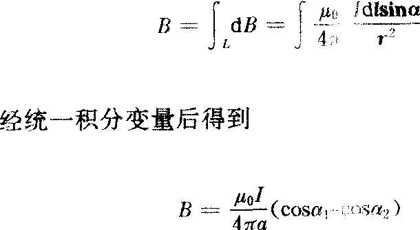式中积分遍及全体电流元。毕奥—萨伐尔定律是描写电流元所产生的磁场的定律,与静电场中库仑定律的地位相当。它是静磁场中的基本定律,由它出发可推出磁场的两个重要定理,即磁场的高斯定理及安培环路定理。在普通物理阶段,可应用毕奥—萨伐尔定律,通过积分求磁感应强度B。例如, ❶可求载流直导线的磁场。设导线长L,电流为I,P点至导线的垂直距离为α,见图2。在距o为l处取电流元⨜dl,它到P点的矢径为r,dl与r夹角为α。导线上各元段在P点的dB方向相同,均垂直指向纸内,于是可将矢量积分改变为标量积分 ![]() 若导线可视为无限长,则B=μ0I/2πa;若为半无限长,则B=μ0I/4πa。可看出,对于可视为无限长载流导线的电流I,产生的磁场的B只与a有关,a相同处,B也相同。在与电流垂直的各平面内,B线是以电流为中心的同心圆。 ❷载流圆线圈轴线上一点P的磁场可用类似的方法到圆心的距离。轴线上各点的磁感应强度都沿轴线方向,与电流方向组成右手螺旋关系。在圆心处,x=0,于 ![]() ❸载流直螺线管轴线上一点的磁场,可求出为B=μ0nI/2(cosβ2-cosβ1),若螺线管可视为无限长,则得B=μ0nI,式中n为单位长度上的匝数。