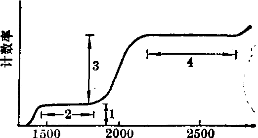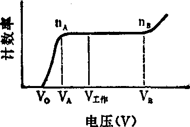 图4 G-M计数管的坪曲线 据管子的坪曲线来选定。正常的G-M计数管有一段比较平坦的工作区(VA-VB),称为坪区。在坪区内,外加电压对计数率影响不大,通常将电压每增加100V所发生的计数率增加的百分数称为坪斜。一般有机管的起始电压在1,000V左右,坪长在200V以上,坪斜<5%/100V;卤素管起始电压在300V左右,坪长在80V以上,坪斜<10%/100V。通常工作电压选在坪区的1/3~1/2之间。 在坪区末端,电压升高时,计数率急剧上升。此时已进入“连续放电区”,计数管极易损坏,使用时必须防止。 G-M计数管对带电粒子的探测效率接近100%。但是α粒子和β粒子穿过管壳时损失很大。为了增大穿透比例,计数管可制成钟罩形,底部有一层很薄的云母窗,使粒子易于透过。 G-M计数管对γ线的探测主要靠射线打在阴极上产生次级电子,再由这些次级电子进入灵敏体积而被记录。探测效率仅1%左右。这是G-M计数管的主要缺点之一。 G-M计数管每记录一个入射粒子,由于“正离子鞘”的影响,靠近中心阳极处电场被暂时削弱。此时,如果马上又射入一个粒子,将不能形成一次“电子雪崩”,收集电荷很少,不能被记录。要等到正离子鞘向阴极漂移一段距离,中心阳极附近电场逐渐恢复后才能重新记录入射粒子。这段时间称“死时间”,也称“分辨时间”。G-M计数管的分辨时间在100~200μs范围。 在测量较强的放射源时,会发生漏计现象,须进行漏计数校正。校正方法如下: 设实测计数率为m,探测器分辨时间为τ,放射源应有计数率为n,则应有的计数率