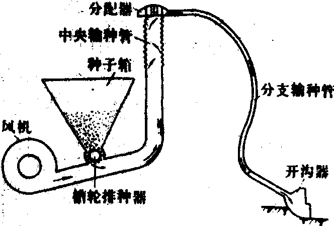 气力式条播机示意图 发达国家在高速精播粒距较大种子形状较规则作物方面已有较好的产品。但豆类、甜菜等小粒距作物的高速精播,小麦等长粒种子精播及异形种子蔬菜的精播等有待进一步研究。气力式播种机airflow planter利用气流排出种子并输送到种沟的播种机械。按排种器的结构型式,有气吹式和气吸式两类。可用于撒播、条播、点播和精密播种。气力播种可简化排种装置的构造,提高播种机的通用性,是一种应用日趋广泛的播种机。 |