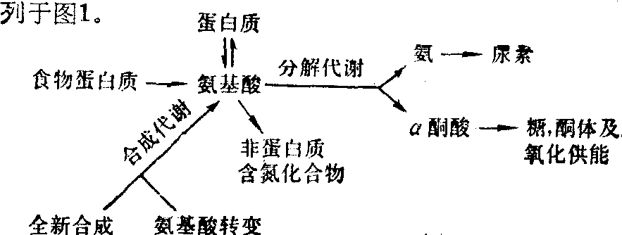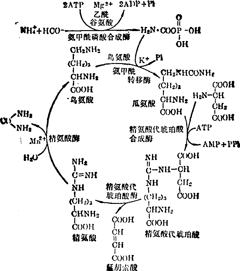 氨的代谢 氨是有毒的,其主要来源是氨基酸分解代谢的脱氨基作用及由肠道吸收进入肝脏的。氨基酸的脱氨基作用,上已述及,而吸收来的氨则是肠道中遗留的氨基酸及蛋白质,由细菌的腐败作用所产生,随消化液进入肠道的尿素也可为细菌分解成CO2及NH3,经门静脉而进入肝脏。不论是来自脱氨基作用的、还是从肠吸收来的氨的90~95%皆在肝内通过尿素循环与CO2结合生成无毒的尿素,并由尿液排出体外。另外,氨也可与谷氨酸合成谷氨酰胺,还可通过联合脱氨基的逆行,以氨基化α酮酸。这样就将血氨维持在最低水平 (正常情况下人血内氨浓度低于150g/L)以解除其毒害作用。