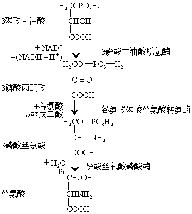 注: *组氨酸现在也有认为是营养上必需氨基酸: ❶至今对其在人和动物体内的合成机理仍甚少了解; ❷已在狗和大白鼠证明其属于必需氨基酸; ❸当初在人进行的限制组氨酸的营养实验的时间过短。 **精氨酸虽然在人体内能合成,但所合成的多被分解为尿素,故需由食物提供一些,以保证儿童的正常生长。 糖代谢提供丙酮酸、草酰乙酸及α酮戊二酸分别作为丙氨酸、天门冬氨酸及谷氨酸合成的原料,而丙氨酸、天门冬氨酸及谷氨酸又可脱去氨基而转变成为相应的α酮酸,经糖异生作用,以生成糖,所以它们在代谢上都是特别活跃的氨基酸。它们的脱氨基及氨基化等作用都在谷丙转氨酶及谷草转氨酶作用下进行。 谷氨酰氨及天门冬氨酸也是构成蛋白质的氨基酸,因二者分别可在谷氨酰胺合成酶及天冬酰胺合成酶催化下合成。在合成中,除需由ATP提供能量外,前者直接需要游离NH3,后者则间接由谷氨酰胺提供NH3 (见“谷氨酰胺及其代谢”和“天门冬酰胺及其代谢”条)。 糖酵解还提供丝氨酸的前体3磷酸甘油酸。3磷酸甘油酸先经脱氢酶作用生成3磷酸丙酮酸,然后在转氨酶的催化下由谷氨酸获得氨基而成为3磷酸丝氨酸,再经磷酸酶脱磷酸而生成丝氨酸。 人及动物的必需氨基酸因体内不能提供相应的α酮酸所以不能进行合成。但是,如果给体内提供相应的α 酮酸,在转氨酶作用下,仍能合成必需氨基酸。例如给人或动物人工合成的苯丙酮酸、α酮异戊酸或α酮异己酸,就能相应合成苯丙氨酸、缬氨酸或亮氨酸,这样,就不必从食物蛋白质供应了。