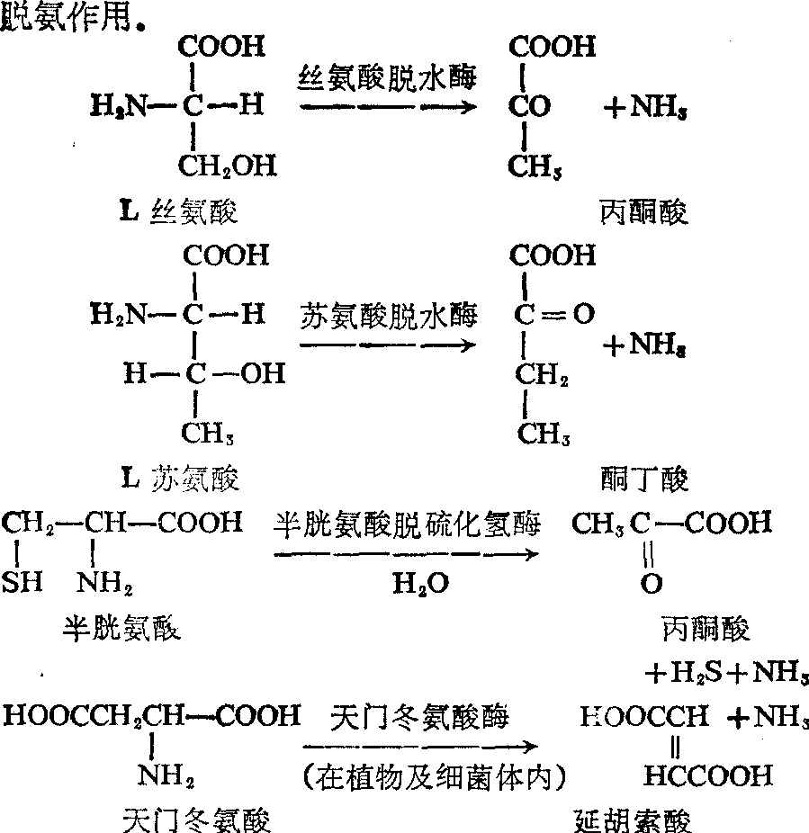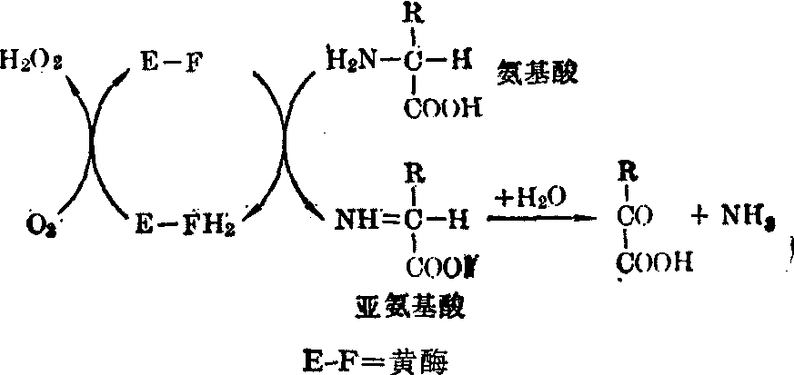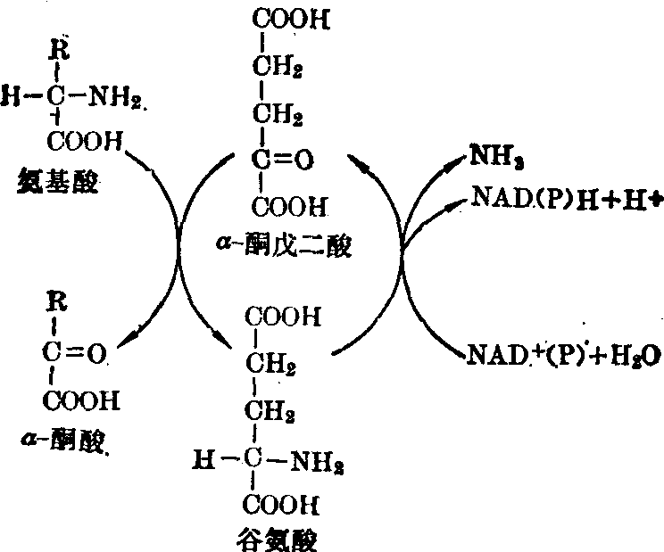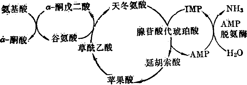 图3 联合脱氨基作用 (2)嘌呤核苷酸循环: 也是脱氨基的一种方式。一定的氨基酸经转氨基作用生成谷氨酸,先经“天冬氨酸循环”再经“嘌呤核苷酸循环”最后通过腺苷酸脱氨酶(AMP脱氨酶)释放出NH3,如以下反应式所示: 其中嘌呤核苷酸循环是通过 “腺苷酸代琥珀酸合成酶”,“腺苷酸代琥珀酸酶”及“AMP脱氨酶”而实现,由于AMP脱氨酶是胞浆中的酶,特别在心及肌肉组织内活性比较高,而谷氨酸脱氢酶的活性在这些组织内最弱,所以认为嘌呤核苷酸循环是心及肌肉组织内的主要脱氨基方式。上述两种脱氨基途径中均有转氨基作用,但是转氨基作用并不能将氨基酸的氨基脱下转变成氨,因此也许不将其看作是脱氨基的一种单独方式,更为恰当一些。 (3) 氧化脱氨基: 由D及L氨基酸氧化酶所催化。二者均为黄酶,已由肝、肾提出,其生理上的重要性尚不甚明确。L氨基酸氧化酶虽作用于大多数L氨基酸,但其活性甚弱; D氨基酸氧化酶以D氨基酸为作用物,但D氨基酸在动物体内并不存在,除非是由细菌引进者。D氨基酸氧化酶还可作用于甘氨酸、D乳酸及L脯氨酸。这样看来,D氨基酸氧化酶的特异性并不强。氨基 酸氧化酶是需氧脱氢酶,其反应如下式所示: ![]() 某些氨基酸,如丝氨酸、苏氨酸、半胱氨酸及天门冬氨酸,在各自的特异酶作用下,脱去氨基,可称作直接作用。