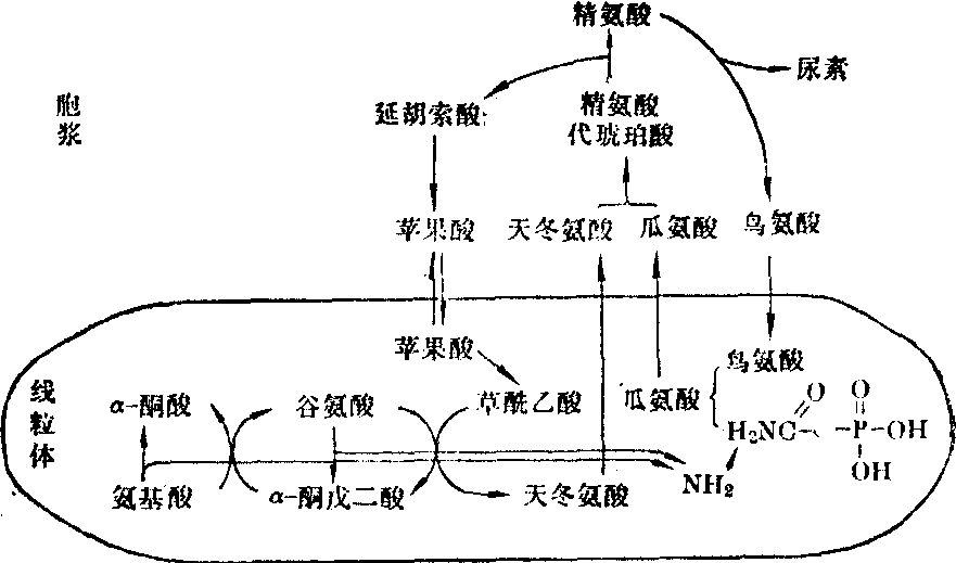 图4 尿素循环 尿素循环 体内合成尿素的机构主要为肝,称作“尿素循环”或“鸟氨酸循环”。循环中的反应也在肾、皮肤、脑及血细胞中存在,但其在这些器官组织中的功用主要是合成精氨酸。在循环中,首先由鸟氨酸合成为瓜氨酸,然后再由瓜氨酸合成为精氨酸,最后精氨酸被肝中大量存在的精氨酸酶水解成尿素及鸟氨酸,而鸟氨酸又进入再一次循环,以合成尿素。这只是循环的简单过程,其实与其他代谢途径亦有一定相连接。尿素分子中的两个氨基,一个来自氨基酸的联合脱氨作用,而另一个则由天冬氨酸提供(图4)追根到底,皆来自氨基酸的分解代谢。 促进尿素循环中各反应的酶分布于细胞内的不同部位,氨甲酰磷酸合成酶及鸟氨酸氨甲酰转移酶分布在线粒体内,而精氨酸代琥珀酸合成酶,精氨酸代琥珀酸酶及精氨酸酶皆存在于胞浆内。从这些酶可以看出尿素循环与天门冬氨酸及氨基酸联合脱氨基作用的联系(图5)。